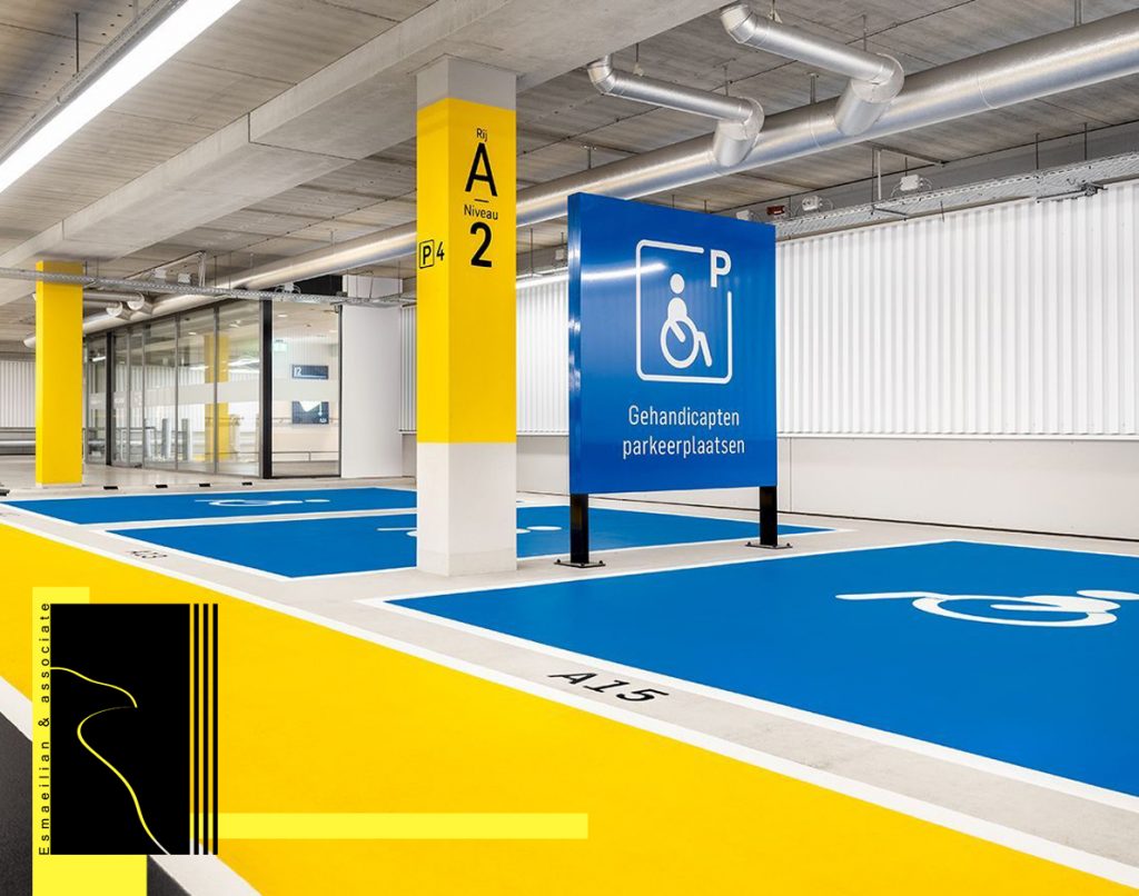 The parking design of buildings on the ground floor or basement is usually considered. Different angles of the car park, such as 90 degrees, 75 degrees, 60 degrees and 45 degrees, can be used in better design and more useful use of parking space. The type of arrangement of parking lots in L form makes it possible to use the overlap of empty space between them to create more parking spaces or to create facilities for facilities, warehouses, stairs and elevator systems.