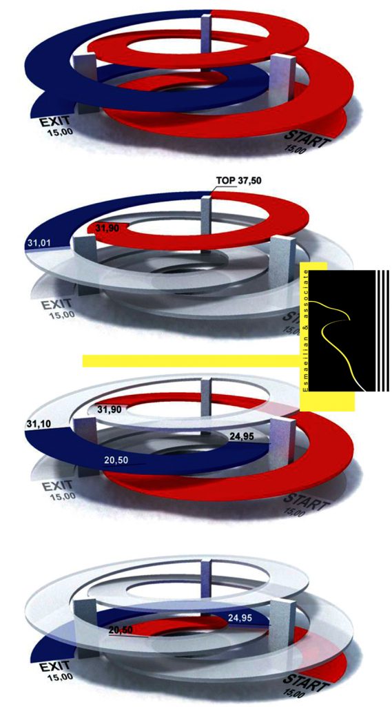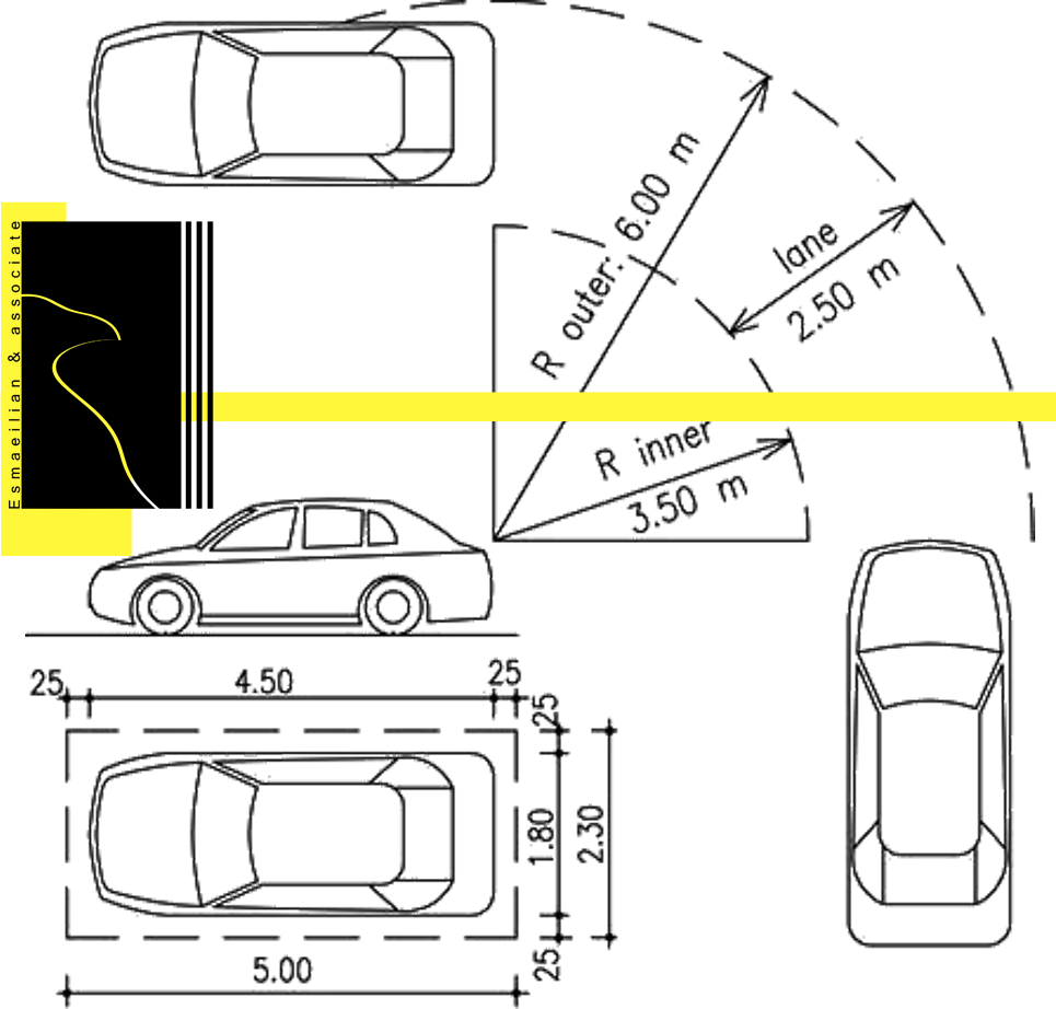 The turning radius of the ramp is at least 6.50 meters from the arc ramp axis. And if the width of the ramp is 5 meters, the radius will increase to 7.25 The number of parking lots in residential units is defined in proportion to the area of the building and the residential unit. For residential units smaller than 150 square meters; A parking lot is provided for residential units between 150 square meters and 250 square meters; Two parking spaces required. For residential units more than 250 square meters; Three parking spaces are required.