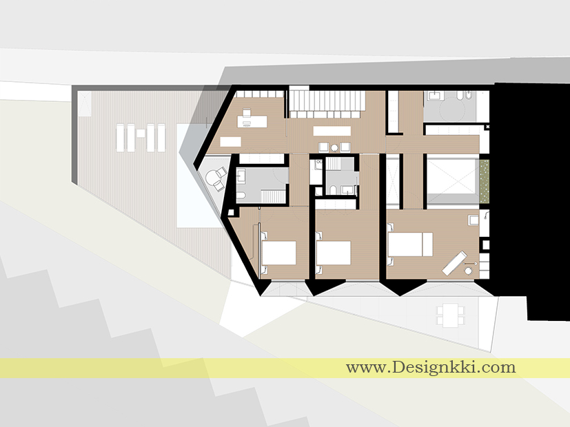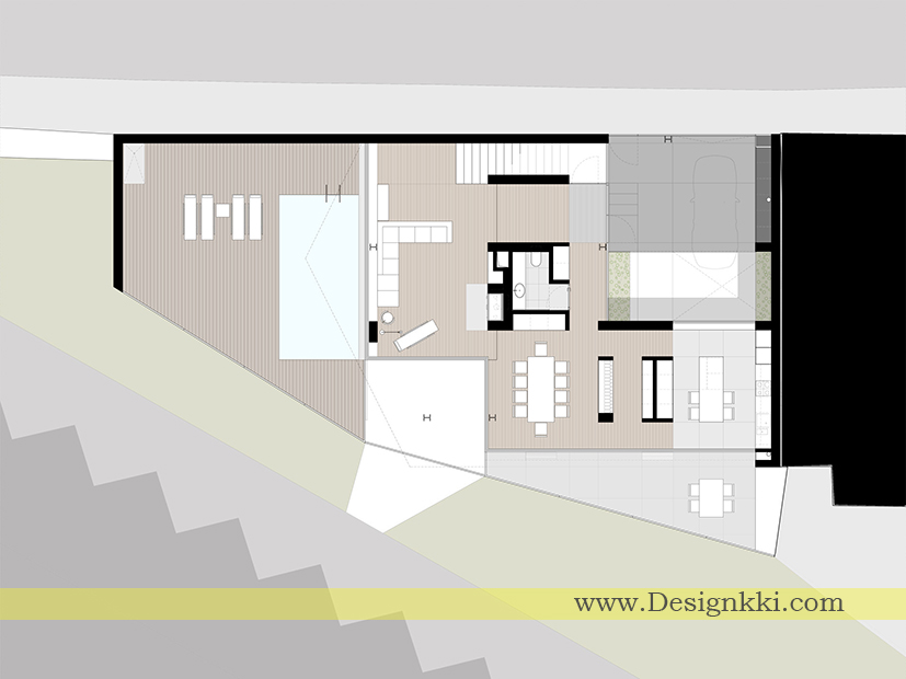 اختلاف ارتفاع از خیابان اصلی به خیابان یک کف نیمه دفن شده اختصاص داده شده به مناطق فنی است که ارتباط مستقیمی با خیابان دارد که اقیانوس را ادغام می کند. این عملکرد به دو سطح تقسیم می شود در حالی که طبقه همکف که به خیابان اصلی متصل می شود به حوزه اجتماعی اختصاص یافته است، طبقه اول مخصوص حوزه خصوصی است.