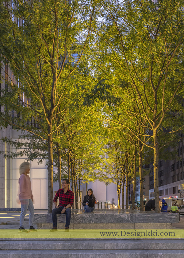 پلازا مرحله مناسبی برای جشن عکاسی، موسیقی، هنر و طراحی، کدگذاری و موارد دیگر از علاقه های شرکت اپل است. پله های گسترده در امتداد لبه ها مردم را به فضا دعوت می کند تا در یک مرکز شلوغ زندگی شهری جمع شوند. صندلی های سنگی که توسط درختان سایه انداخته شده و با چشمه های خطی در امتداد لبه های خیابان 58 و 59 هم مرز هستند، مکانی برای استراحت و بافر آرام را از ترافیک شلوغ، در کنار دو ورودی کمکی گسسته ایجاد می کنند که دسترسی به فروشگاه زیر را افزایش می دهد.