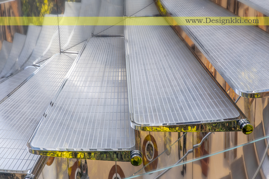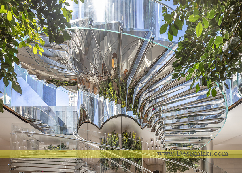 در مرکز میدان یک مکعب شیشه ای مشخص وجود دارد که نشانگر مرکز فعالیت و جلب توجه به فروشگاه زیر است. بازدید کنندگان از زیر مکعب شیشه ای پرشده از نور، از یک بالابر دایره ای جدید و از پلکان های ضد زنگ تماشایی پایین می آیند. هر عنصر از طبل آسانسور تا پله های پله با فولاد ضد زنگ آینه ای ساخته شده است، مناظر و انرژی منطقه اطراف را منعکس می کند. مواد با دقت انتخاب شده کاملاً از شکل و انعکاسهای بیکران جلوگیری می کنند.