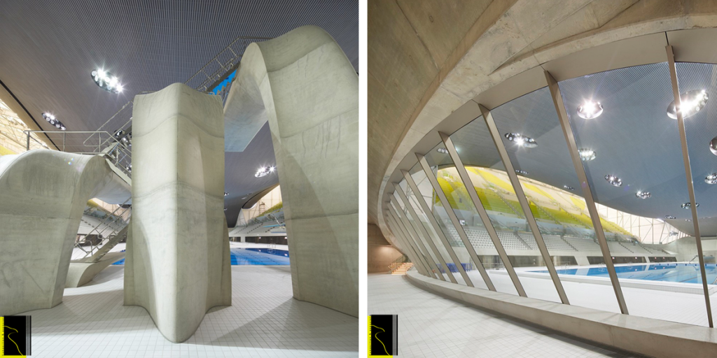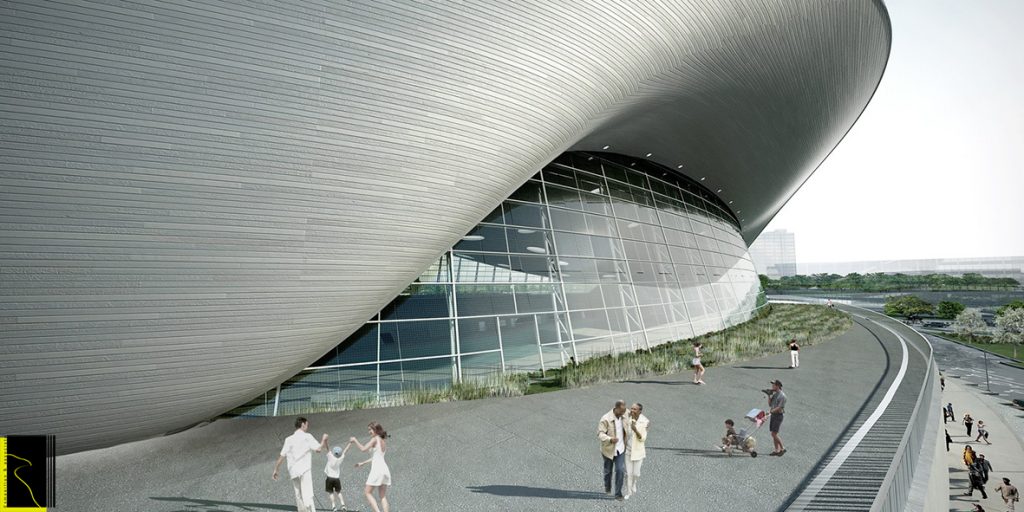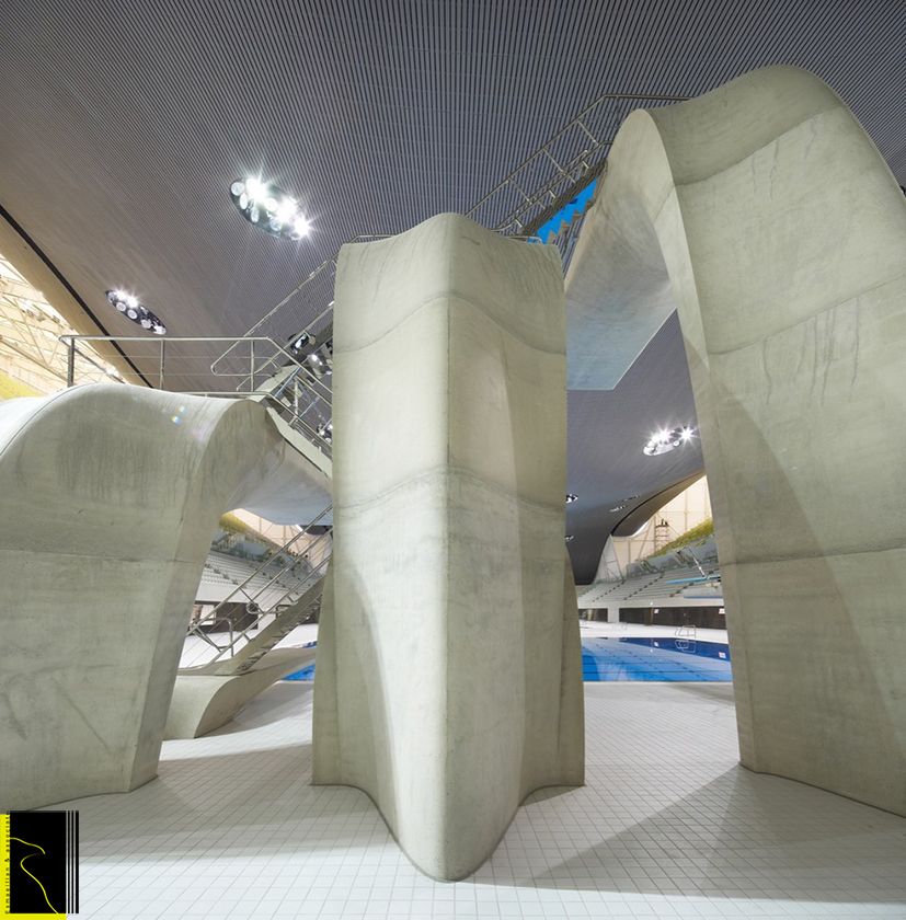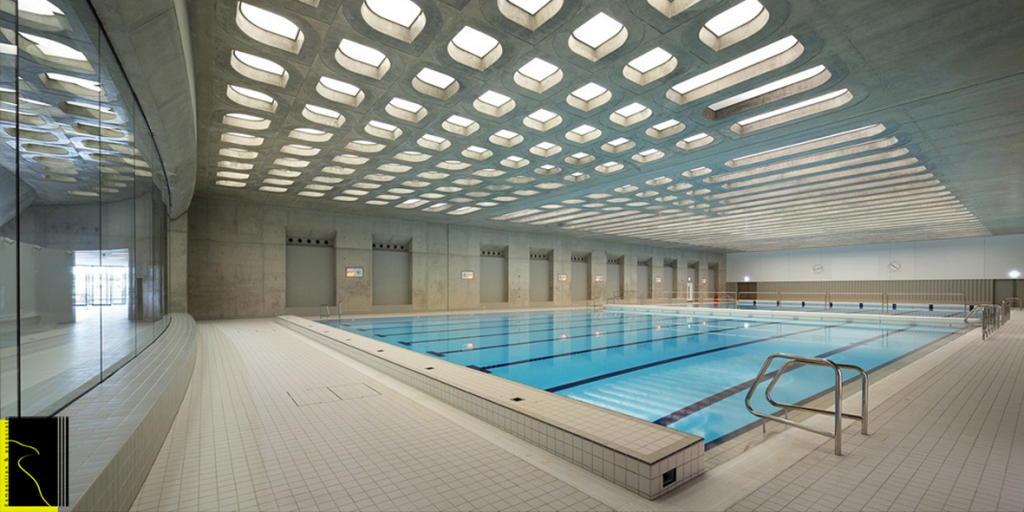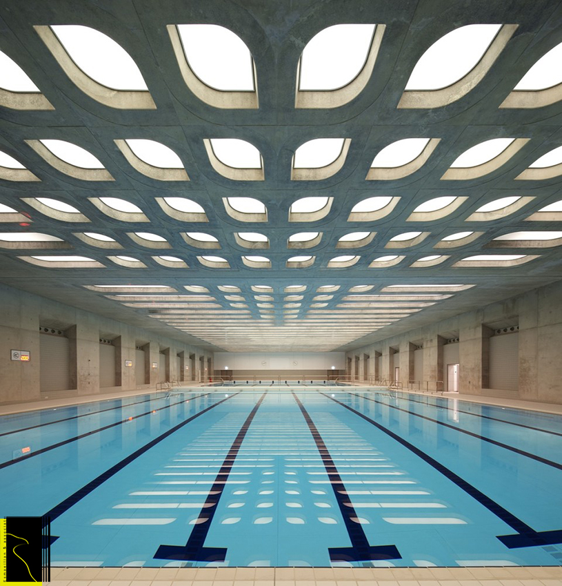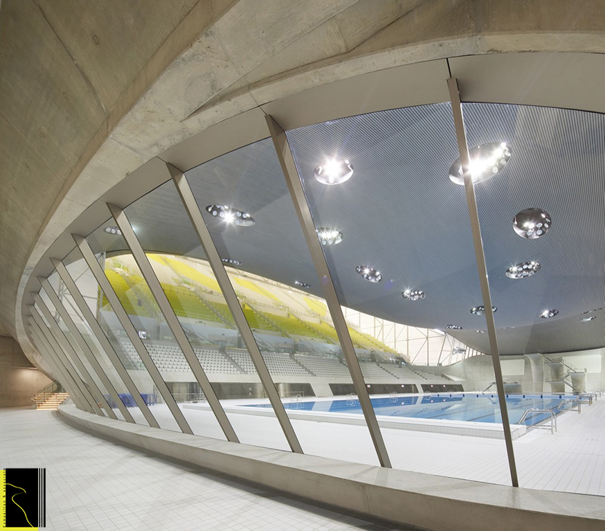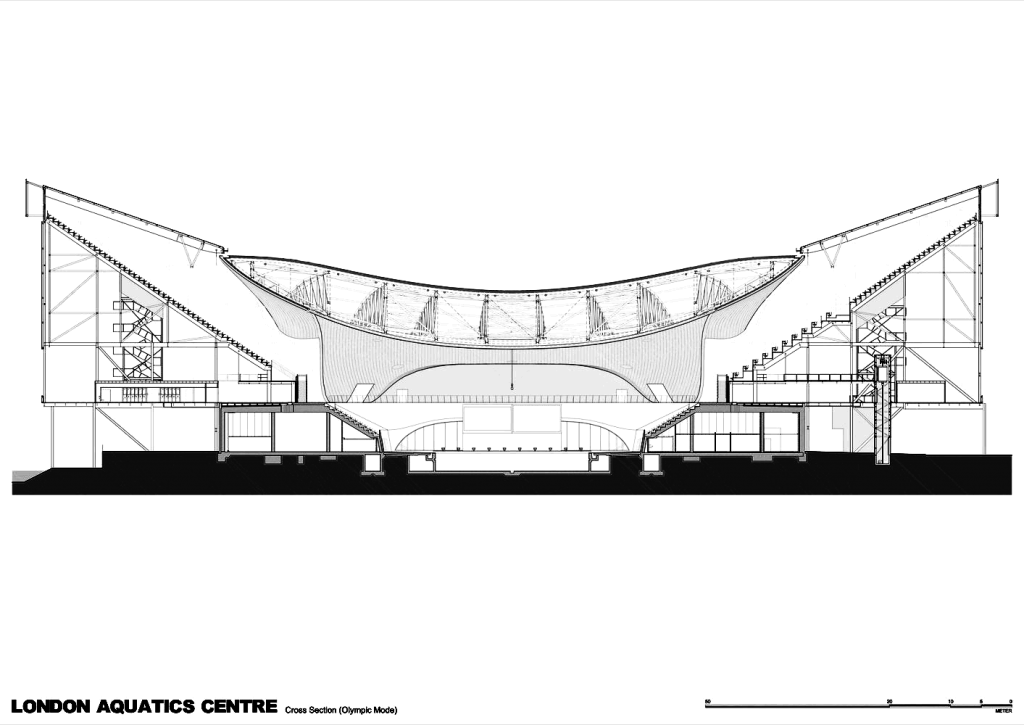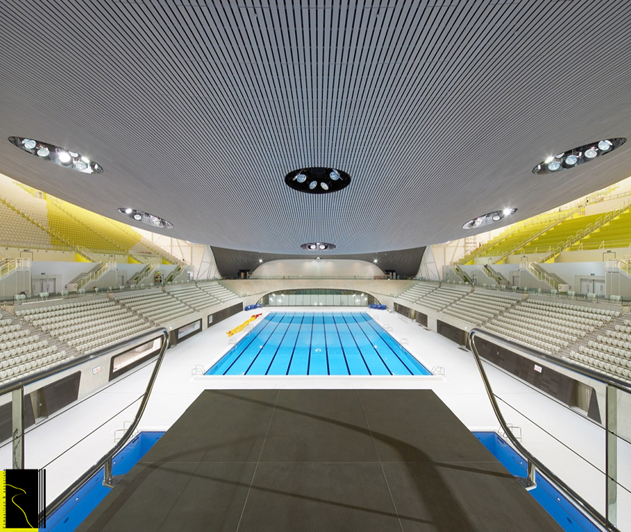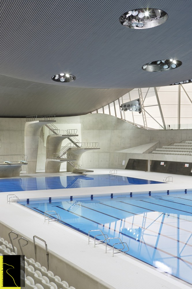 المپیک تولید می شود. از هندسه دو خمیده برای تولید یک ساختار قوس پارابولیکی استفاده شده است که ویژگی های منحصر به فرد سقف را ایجاد می کند. برای تمایز بین حجم استخر رقابت و استخر غواصی ، سقف قایقرانی می کند. با پیش بینی فراتر از پاکت سالن استخر ، سقف به قسمت های خارجی و ورودی اصلی روی پل گسترش می یابد که دسترسی اولیه در، پایه ریزی شده و سپس با یک نمای شیشه ای تکمیل میشود..