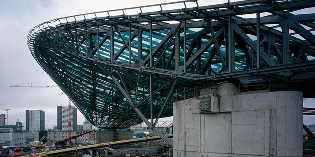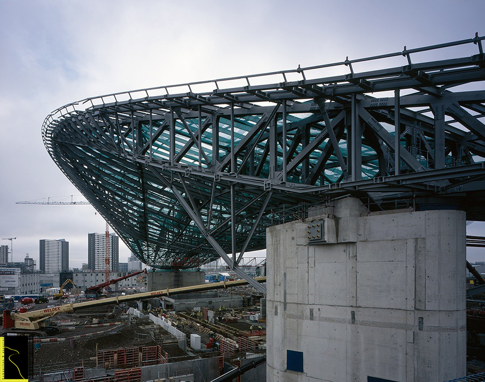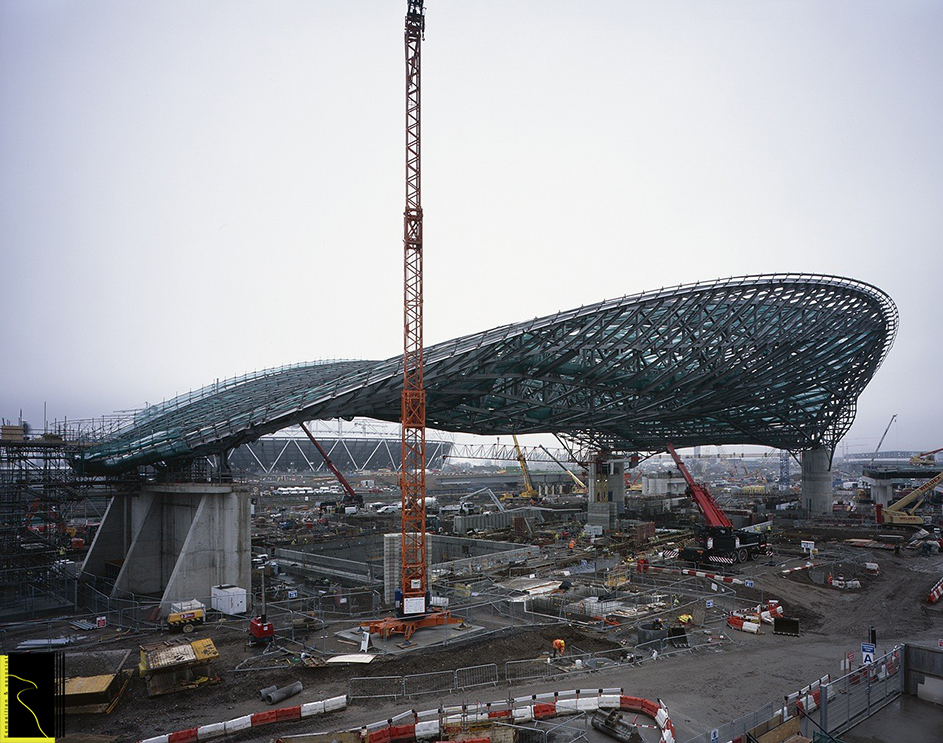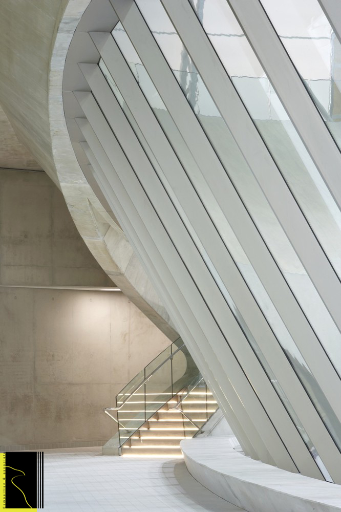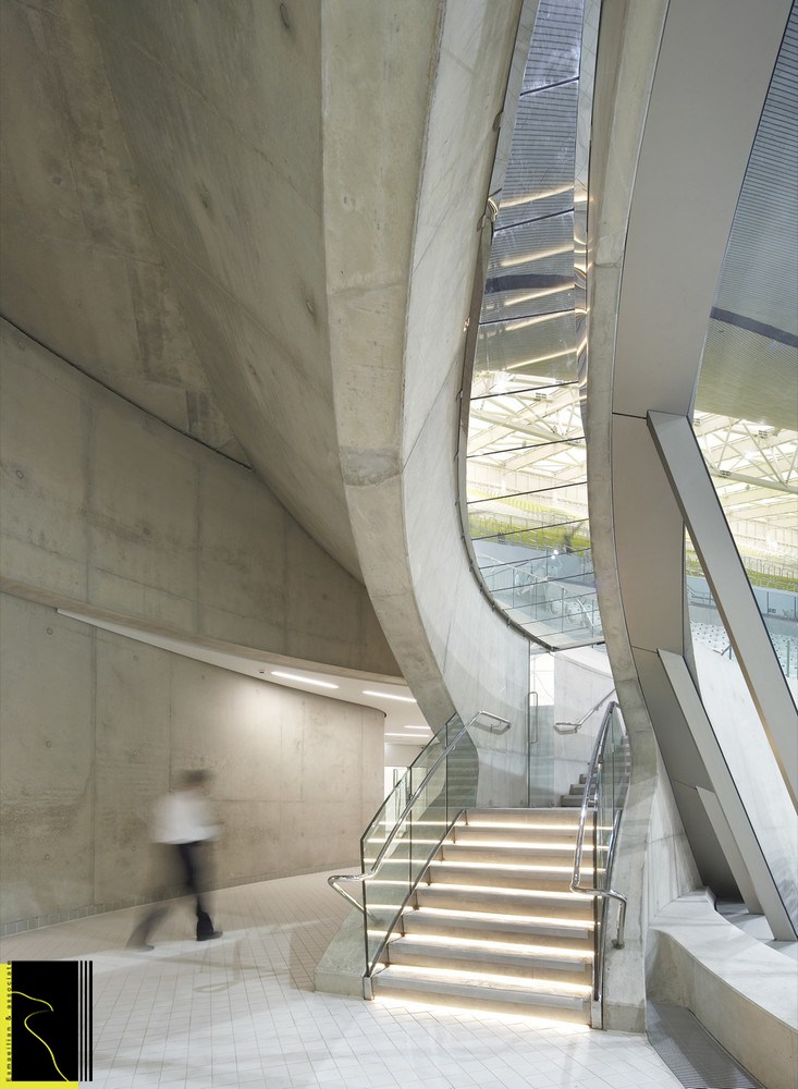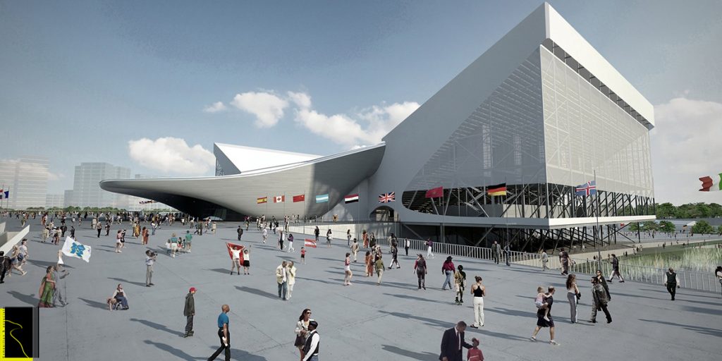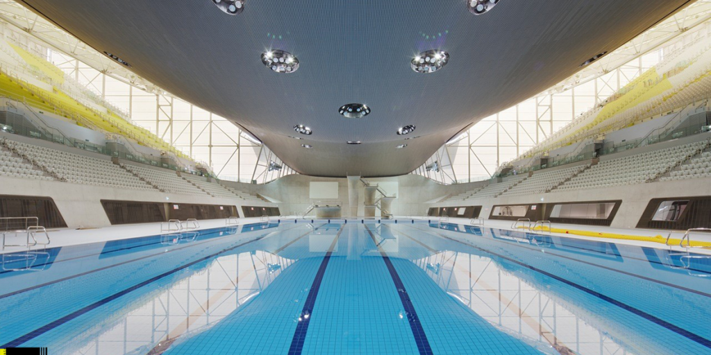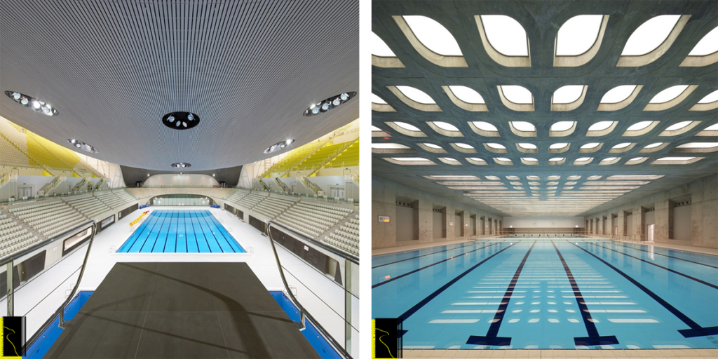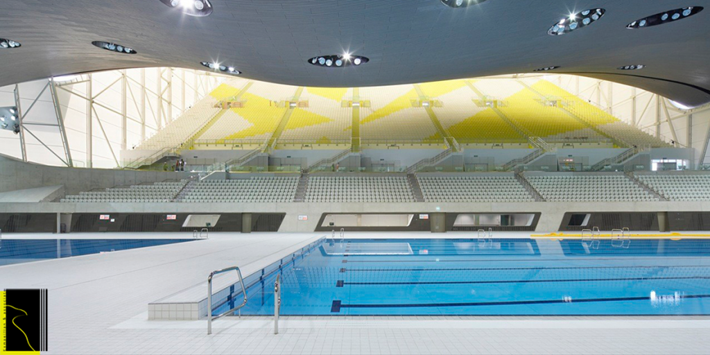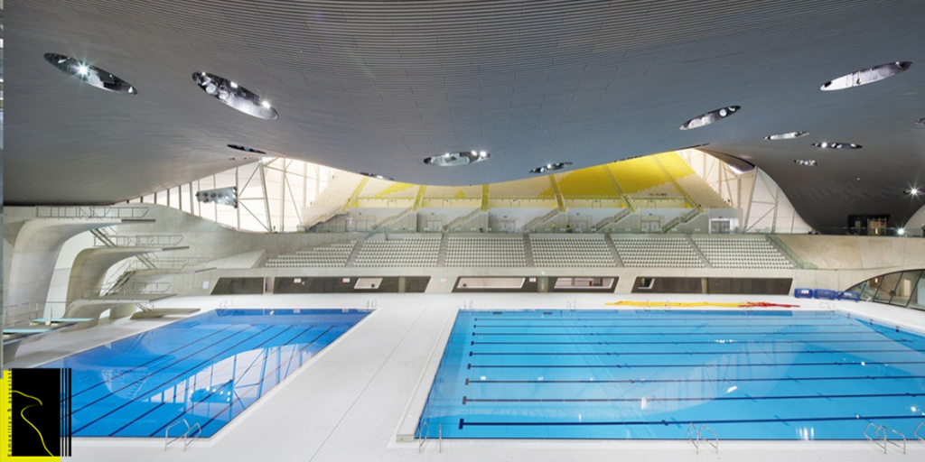 المپیک تولید می شود. از هندسه دو خمیده برای تولید یک ساختار قوس پارابولیکی استفاده شده است که ویژگی های منحصر به فرد سقف را ایجاد می کند. برای تمایز بین حجم استخر رقابت و استخر غواصی ، سقف قایقرانی می کند. با پیش بینی فراتر از پاکت سالن استخر ، سقف به قسمت های خارجی و ورودی اصلی روی پل گسترش می یابد که دسترسی اولیه در، پایه ریزی شده و سپس با یک نمای شیشه ای تکمیل میشود..