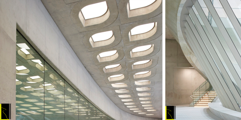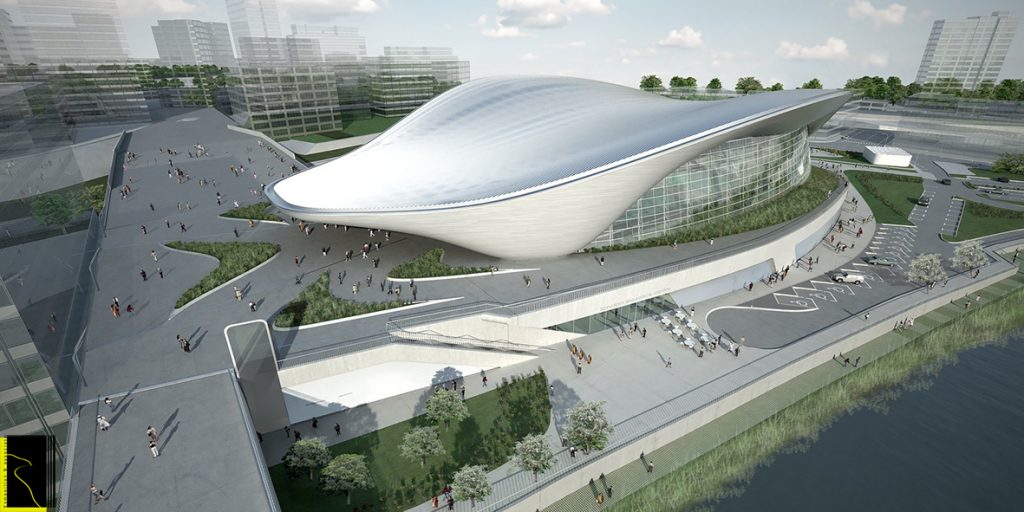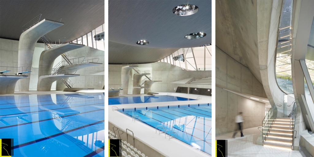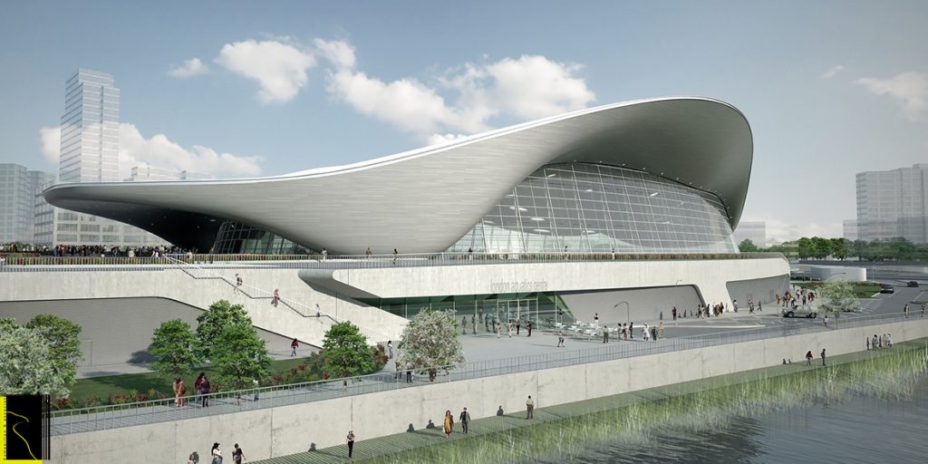 مفهوم معماری مرکز آبزیان لندن با الهام از هندسه سیال آب در حال حرکت ، ایجاد فضاها و یک محیط اطراف که منعکس کننده مناظر کنار رود پارک المپیک است. سقف عایق بندی شده به عنوان موج از سطح زمین بیرون می آید – استخرهای مرکز را با ژست یکپارچه سیال محاصره می کند ، ضمن اینکه حجم استخرهای شنا و غواصی را نیز توصیف می کند.