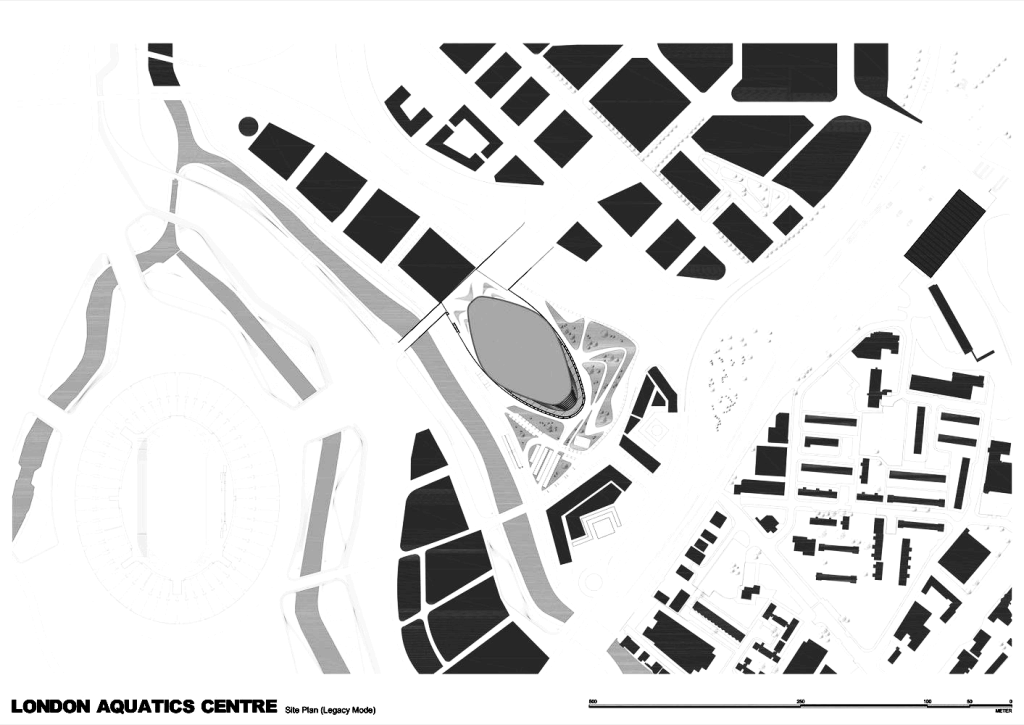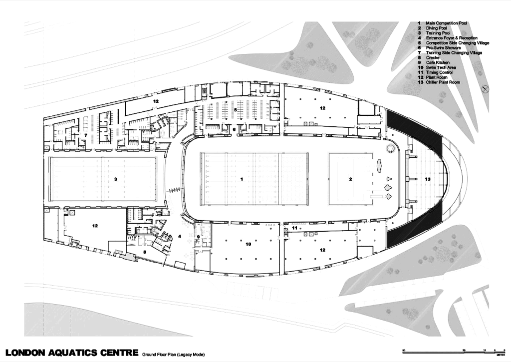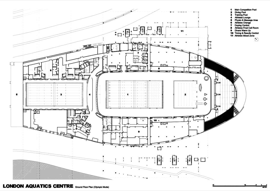 مرکز آبزیان در یک محور متعامد عمود بر پل شهر استراتفورد برنامه ریزی شده است. هر سه استخر در این محور تراز شده اند. استخر آموزشی در زیر پل با استخرهای مسابقه و غواصی واقع در سالن استخر بزرگ که در پشت بام محصور شده است. استراتژی کلی این است
