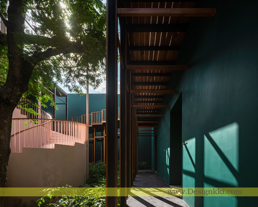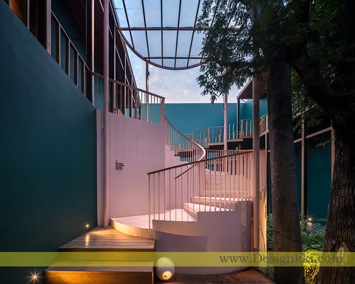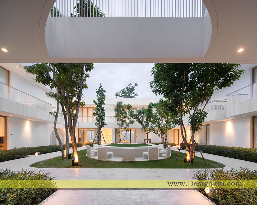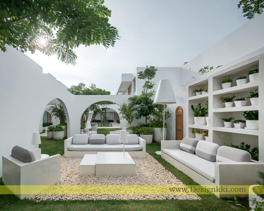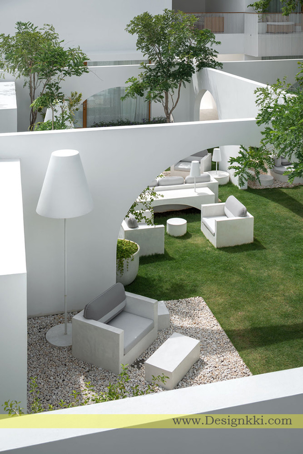 هر حیاط در کنار جاده یک ویژگی داخلی دارد زیرا فکر می کنیم یادآوری فضاها برای مهمانان ما راحت تر است. این 5 حیاط ،حیاط پله های بیرونی، اتاق ناهار خوری در فضای باز، اتاق نشیمن در فضای باز، اتاق بازی در فضای باز و اتاق خواب در فضای باز نامگذاری شده اند.