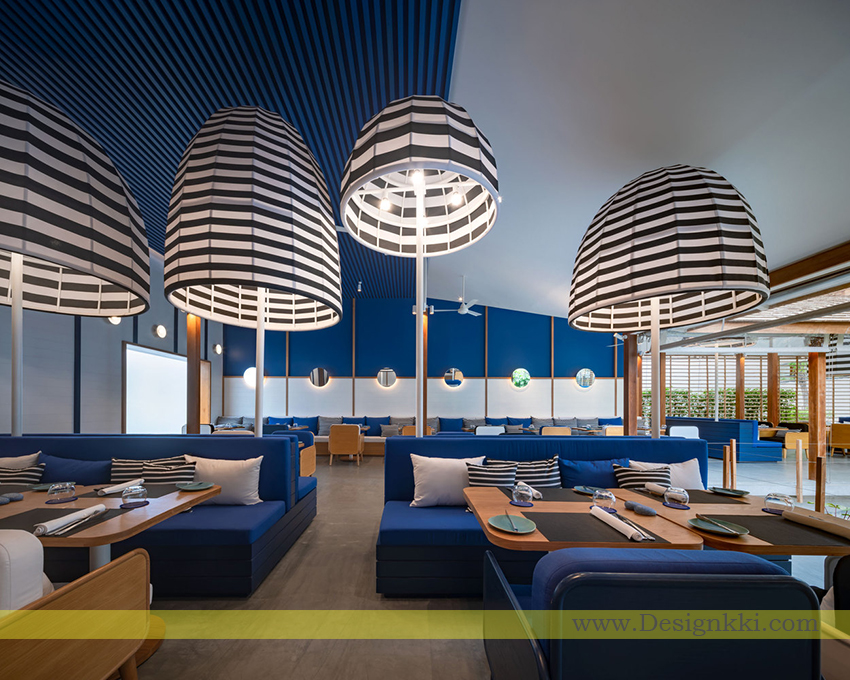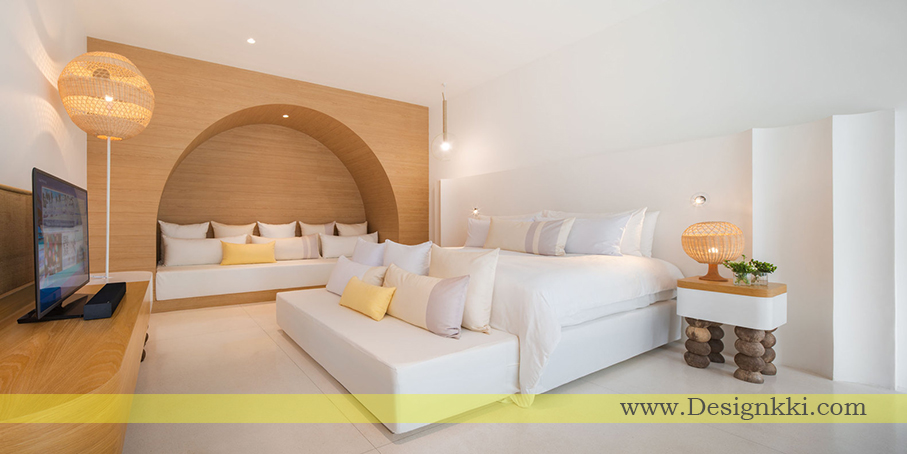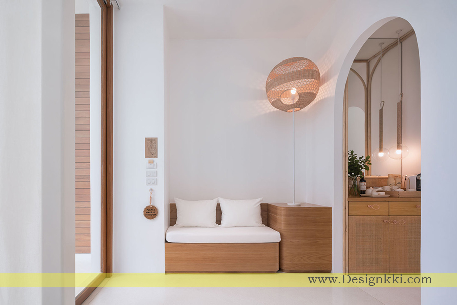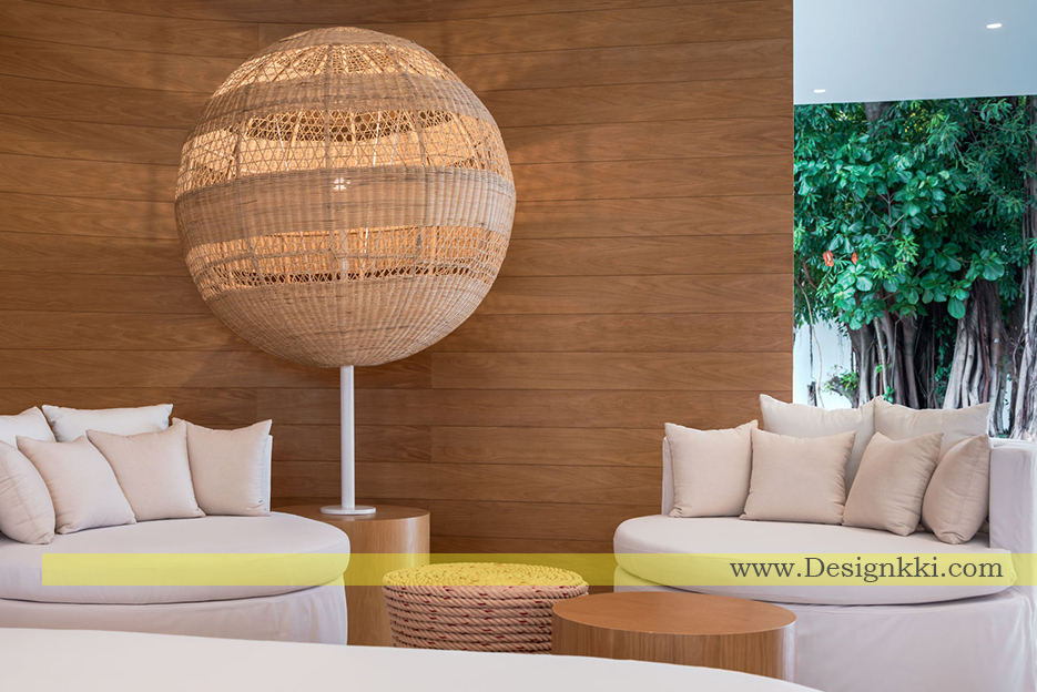 ما همچنین انواع اشیا ترکیب تشکیل شده در اتاق را طراحی می کنیم، مانند لامپ ها، کیف ساحل، قفسه های حصیری و طناب های گره دار برای کشیدن کشوها.
