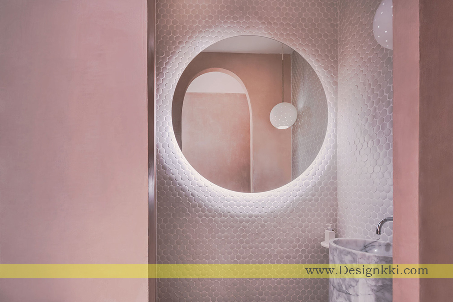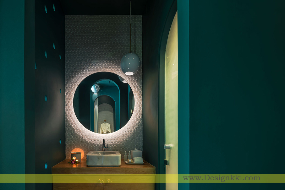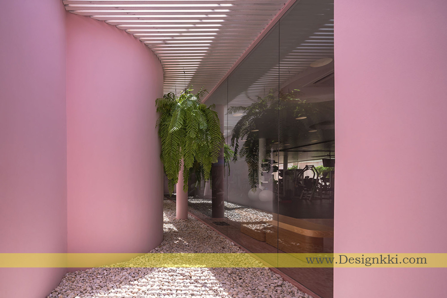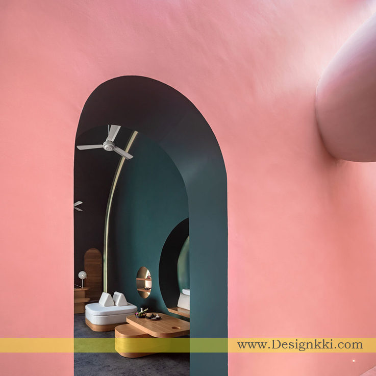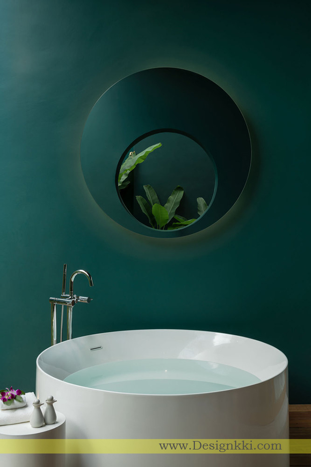 این دیوارهای رنگی یک تجربه فضایی جدید را برای میهمانان آبگرم فراهم می کند. با حرکت خورشید، نور جهت خود را تغییر می دهد، معماری زنده می شود. وان اتاق اسپا در باغ احاطه شده توسط دیوارهای سبز تیره قرار گرفته است.