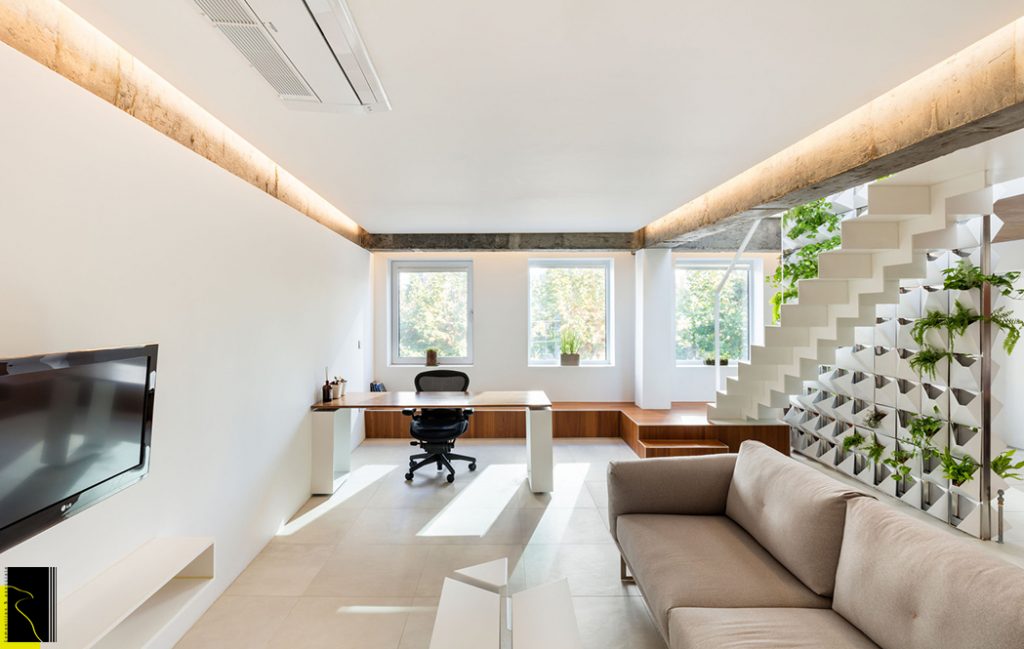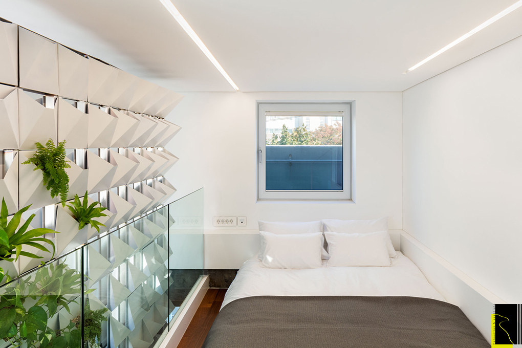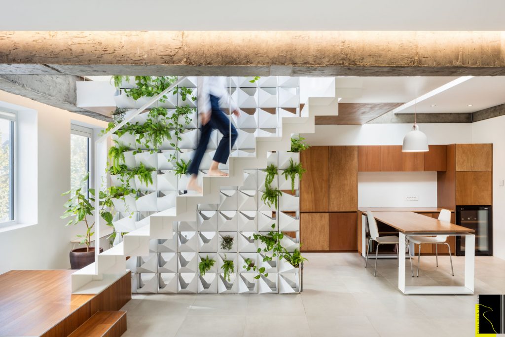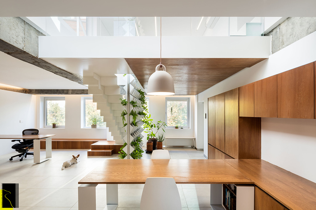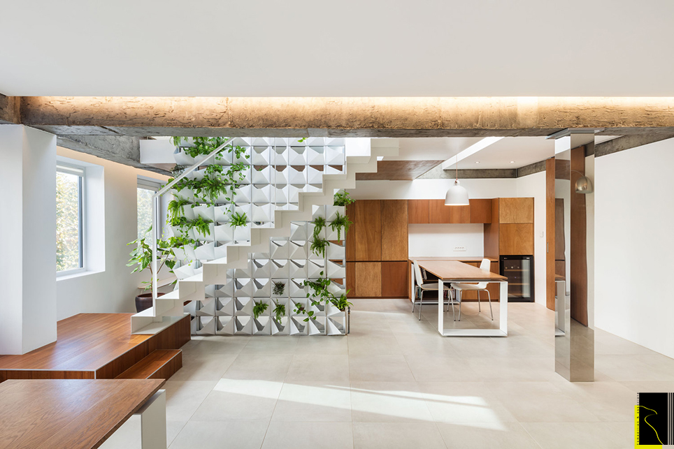 لوفت جونگوا-دونگ یک اقامتگاه تک خوابه است که در طبقه بالای یک ساختمان صنعتی ۳۰ ساله قرار دارد. مشتری یک زن مجرد و حرفه ای محور است و علاقه شدیدی به بهزاست دارد. به درخواست او، این ارتفاع دو طرفه، دیوار سبز دو طرفه به عنوان محور محل اقامت ایجاد شد. دیوار سبز با اندازه گیری ۲٫۱ در ۴٫۵ متر به عنوان صفحه ای عمل می کند که منطقه زندگی را از ورودی تقسیم می کند. دیوار سبز از 56 واحد کمی متفاوت تشکیل شده است, با هم ایجاد یک جریان مداوم. واحدها را می توان به راحتی از دیوار برای تعمیر و نگهداری حذف در کنار دیوار سبز پلکان جدیدی قرار دارد که اتاق نشیمن اصلی و اتاق خواب طبقه بالا را به هم متصل می کند. محل اقامت دارای آشپزخانه کوچک، کمد پیاده روی، توالت، اتاق رختشویی، و ناهار خوری طرح باز و منطقه زندگی در طبقه اصلی است. یک اتاق خواب کوچک با حمام در طبقه بالا وجود دارد. پالت ماده برای تار کردن تفاوت بین قدیمی و جدید انتخاب شده است. بتن، سنگ آهک رنگ کف کاشی، چوب سه لا رنگی، و کف ساج ایجاد هماهنگی به جای کنتراست. ساختار بتن موجود شده است به طور انتخابی در معرض اضافه کردن ناهمی, و چوب سه لا لوان رنگی و کف ساج اضافه کردن گرما به فضا.