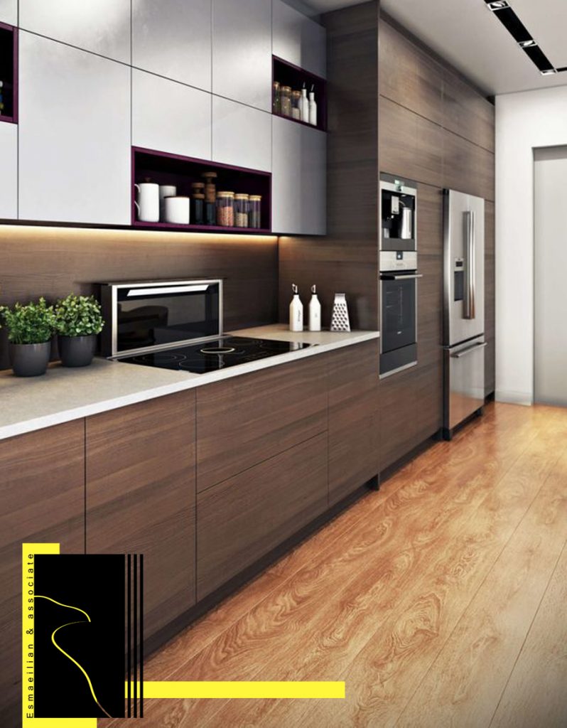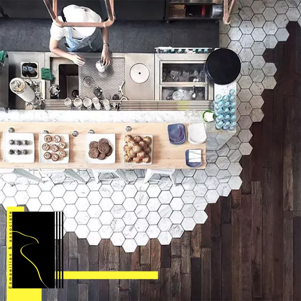 کفپوش مکانهای پخت و پز چه از نوع مستقل باشد و چه باز و فضای کار، لازم است از نوع کاشی یا مصالحی مشابه باشد که امکان نظافت و شستوشو آن فراهم باشد. طبق مبحث چهارم مقررات ملی ماده 4-5-5-4-1 کف آشپزخانۀ مستقل و باز و فضاي کار مقابل آشپزخانۀ دیواري باید از کاشی و مصالح مشابه با قابلیت نظافت پوشیده شود.