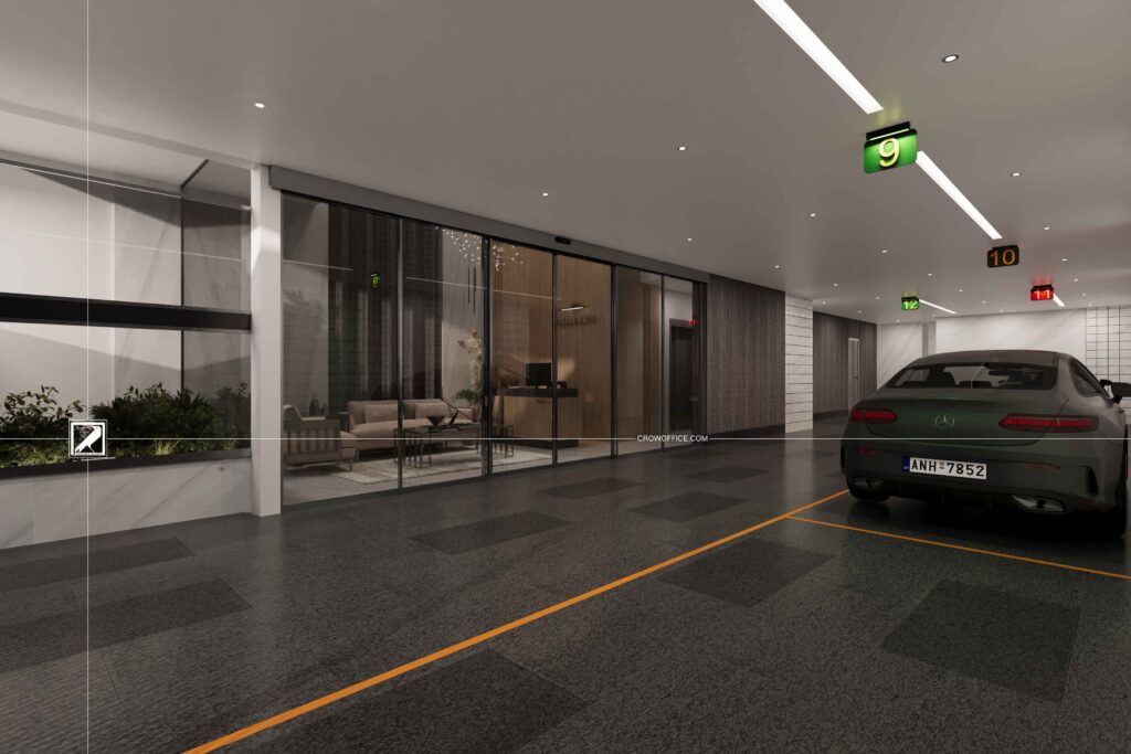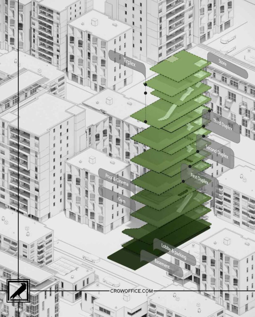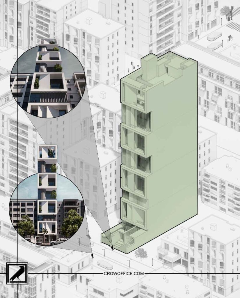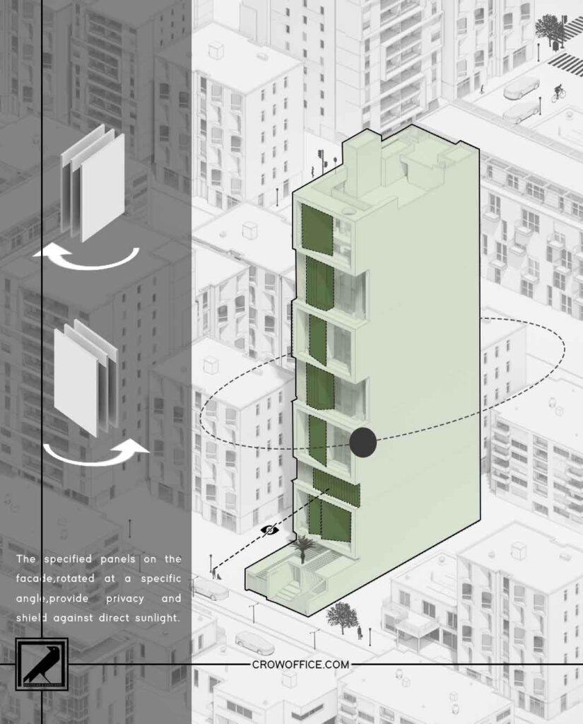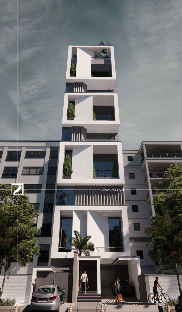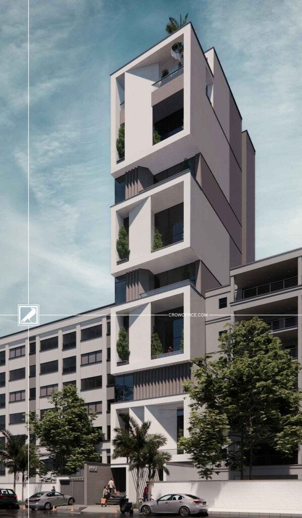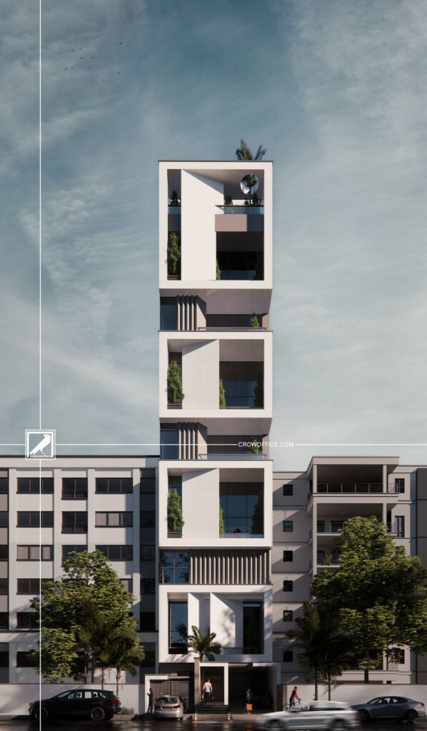 این مجتمع در منطقه کیانپارس اهواز در زمینی به مساحت ۳۰۰ متر مربع با زیربنای ۲۴۵۰ متر در ۱۲ طبقه ساخته شده است. این مجتمع شامل ۲ واحد ۱۵۸ متری و ۳ واحد دوبلکس و یک پنت هاوس ۱۱۴ متری است. نمای این ساختمان با رویکردی مینیمالیستی و مدرن طراحی شده است و با استفاده از فرمهای هندسی خالص، سطوح سفید و فرورفتگیهای جسورانه ترکیبی بصری چشمگیر و متعادل ایجاد کرده است. قابهای حجمی بزرگ در هر طبقه، ریتم عمودی قوی و انسجام بصری را در سراسر نما ایجاد میکنند. این قابها هم به اهداف زیباییشناختی و هم عملکردی خدمت میکنند و عمق میبخشند و سایه ایجاد میکنند. تضاد بین سطوح توپر و تو خالی، بازی جذابی از نور و سایه ایجاد میکند و به ساختمان شخصیتی پویا میبخشد.