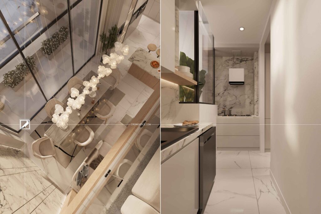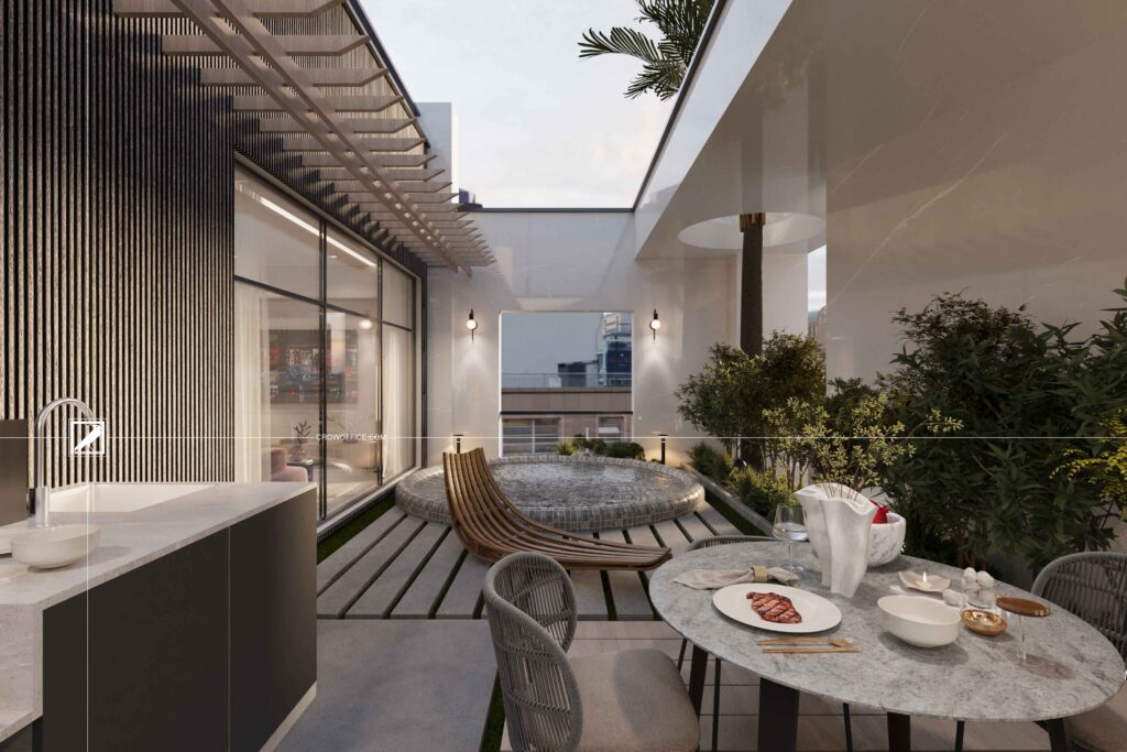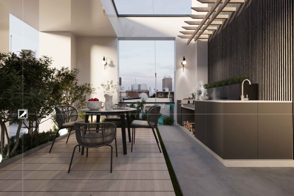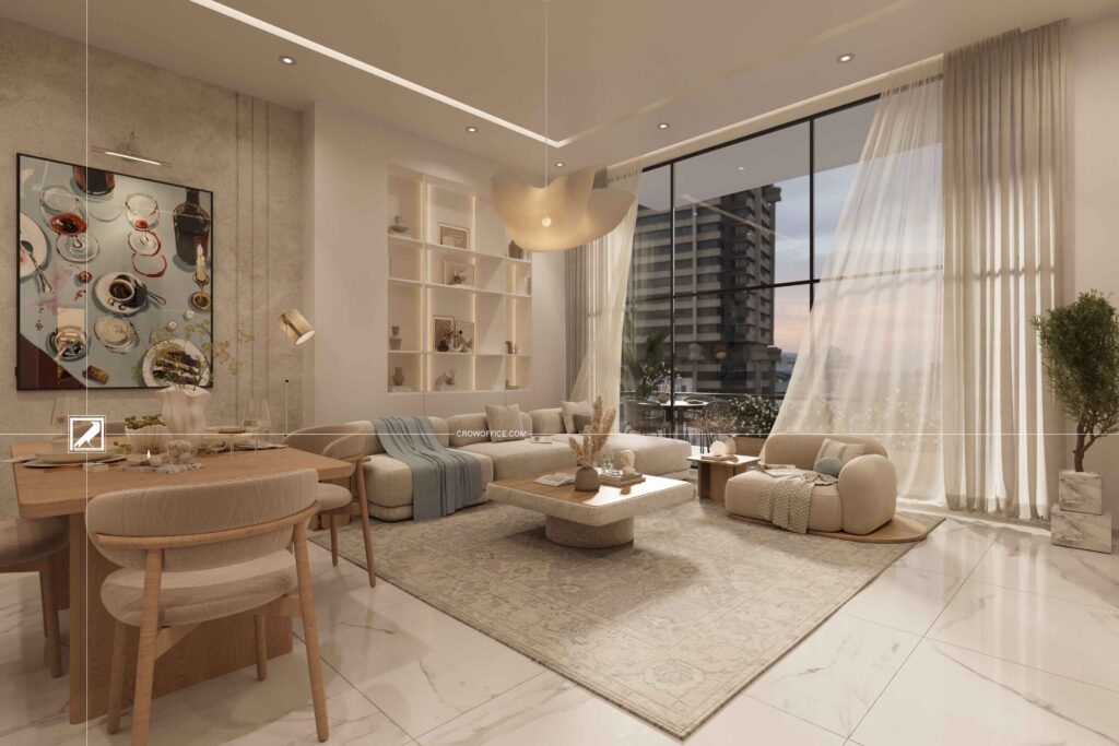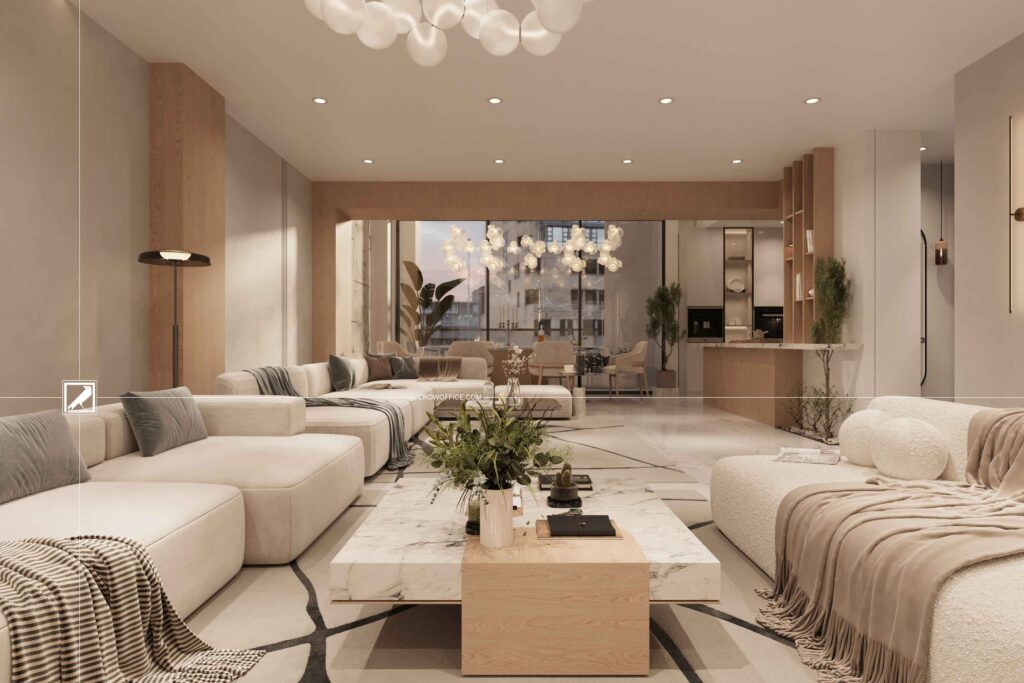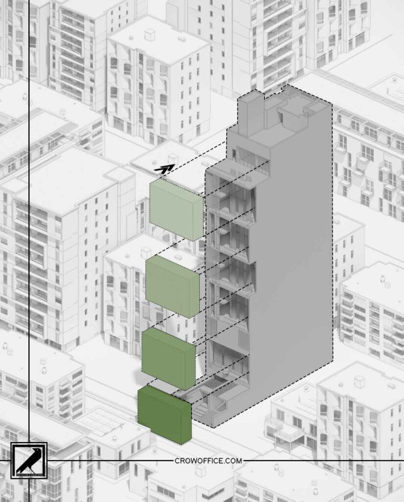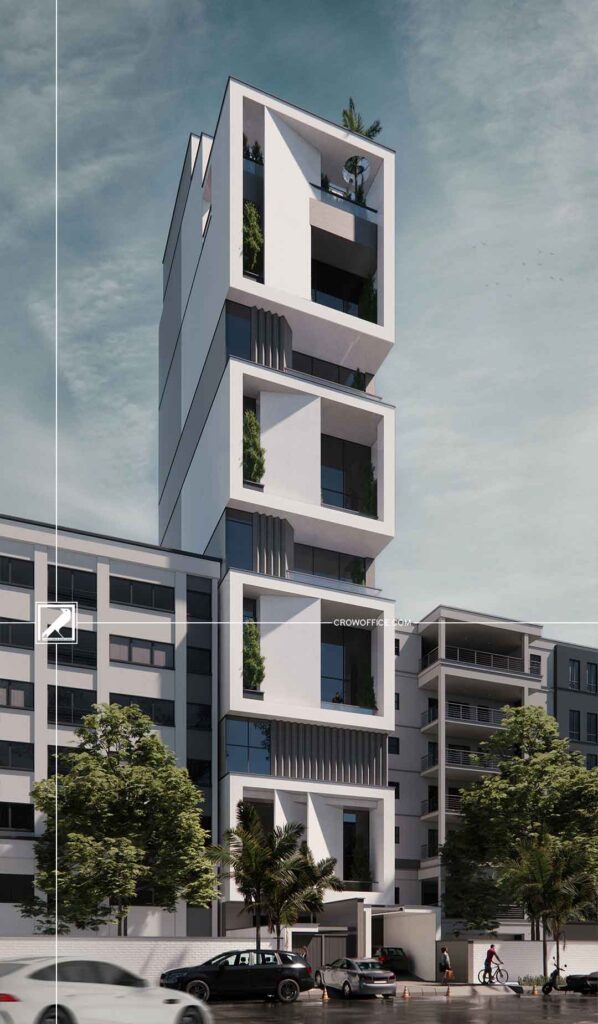 این مجتمع در منطقه کیانپارس اهواز در زمینی به مساحت ۳۰۰ متر مربع با زیربنای ۲۴۵۰ متر در ۱۲ طبقه ساخته شده است. این مجتمع شامل ۲ واحد ۱۵۸ متری و ۳ واحد دوبلکس و یک پنت هاوس ۱۱۴ متری است. نمای این ساختمان با رویکردی مینیمالیستی و مدرن طراحی شده است و با استفاده از فرمهای هندسی خالص، سطوح سفید و فرورفتگیهای جسورانه ترکیبی بصری چشمگیر و متعادل ایجاد کرده است. قابهای حجمی بزرگ در هر طبقه، ریتم عمودی قوی و انسجام بصری را در سراسر نما ایجاد میکنند. این قابها هم به اهداف زیباییشناختی و هم عملکردی خدمت میکنند و عمق میبخشند و سایه ایجاد میکنند. تضاد بین سطوح توپر و تو خالی، بازی جذابی از نور و سایه ایجاد میکند و به ساختمان شخصیتی پویا میبخشد.