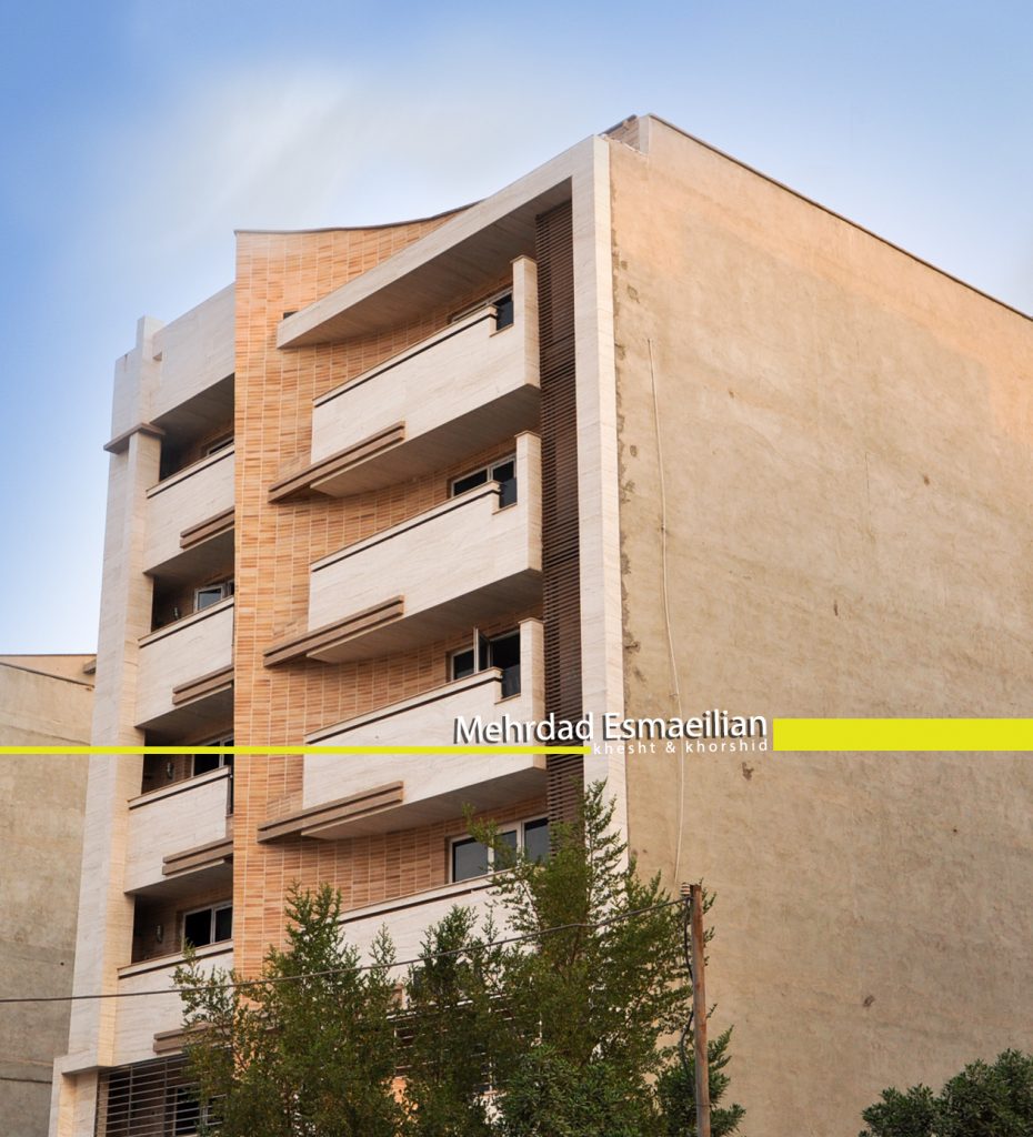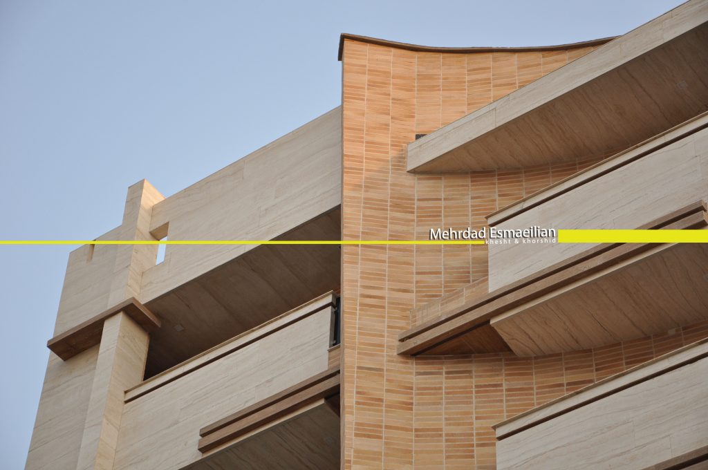 استفاده از ترکیب متریال سنگ و آجر در نما علاوه همساز بودن با اقلیم اهواز ، زیبایی و حس صمیمیت خاصی به ساختمان داده است .قوس آجری اجرا شده در نما در کنار سنگ های کشیده هماهنگی و پویایی را در نما القا می کند و نیز سایه اندازی محدودی برای تراس های مجاور را به دنبال داشته و همچنین کاربرد ترموود های افقی در نمای ساختمان هماهنگی لازم با خطوط افقی نما ایجاد کرده است و اجرای ترموود در ارتفاع عمودی ساختمان کشیدگی ساختمان را بهتر و زیبا تر نشان میدهد.استفاده از آجر و ترمود در قسمتهای داخلی .ساختمان همخوانی نمای خارج و طراحی داخلی را برقرار کرده است