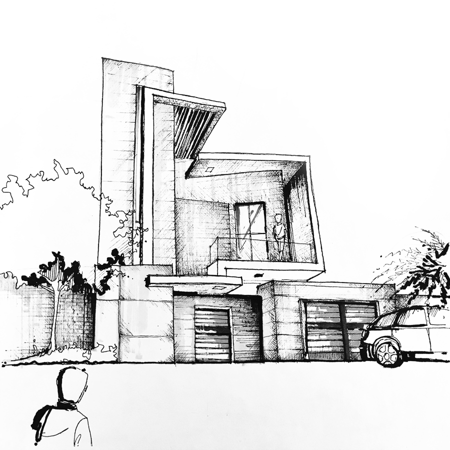 درخواست اولیه مشتری، طراحی ویلا با 3 اتاق خواب در طبقه همکف با یک منطقه 20 * 10 بود. با توجه به قوانین و مقررات شهرداری و عدم امکان ایجاد یک لابی بزرگ، یک ساختمان بزرگ دوبلکس به مشتری ارائه شد. در طبقه اول، یک تالار مربع در دو سطح، اتاق خواب و تخت مخصوص برای مهمانان و آشپزخانه طراحی شده است. در طبقه بالا، یک اتاق خواب اصلی، اتاق خواب 2 اتاق با خدمات جداگانه و توالت، آشپزخانه (اصلی و یک آشپزخانه پخت و پز) و یک سالن خصوصی برنامه ریزی شده است. یک فضای 25 متر مربعی برای حمایت از یک فضای فروشگاه و سرویس بر روی سقف ساختمان استفاده می شود. تراورتن مواد انتخابی در مقابل ساختمان است. با استفاده از خطوط طولی و عرضی قوی، عناصر تراس و کج، فضاهای مثبت و منفی را ایجاد می کنند. کنتراست تاریک و نور و فضای داخلی به رنگ روشن. با استفاده از یک شبکه در پایه، یک جدایی عمودی زیبا از سالن اصلی را ایجاد می کند که در نتیجه فضای ویژه ای صمیمی می شود. از آنجایی که این ساختمان در شهر مشهد واقع در اهواز واقع شده است، شیشه ضد گلوله در این ساختمان به منظور افزایش ایمن است.