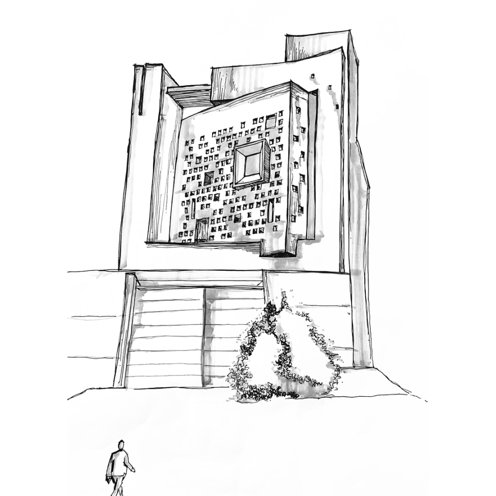 در قسمت پایین که ورودی می باشد پوشش جداره ها بااستفاده از شیشه می باشد . در قسمت بالا یک حجم صلب مربعی شکل وجود داشت . ماحصل ایده چرخش حجم صلب مربعی ،طراحی قاب مریع شکل برای حجم کلی ، تکرار و کشیدگی مربع و تغییر سایز در جداره ی بیرونی ساختمان منجر به طراحی و اجرای نمایی ساده ، خاص و متفاوت شده است. این نما با استفاده از سنگ اجرا شده و مربع های تعبیه شده روی آن با برش روی سنگ ایجاد شده اند.