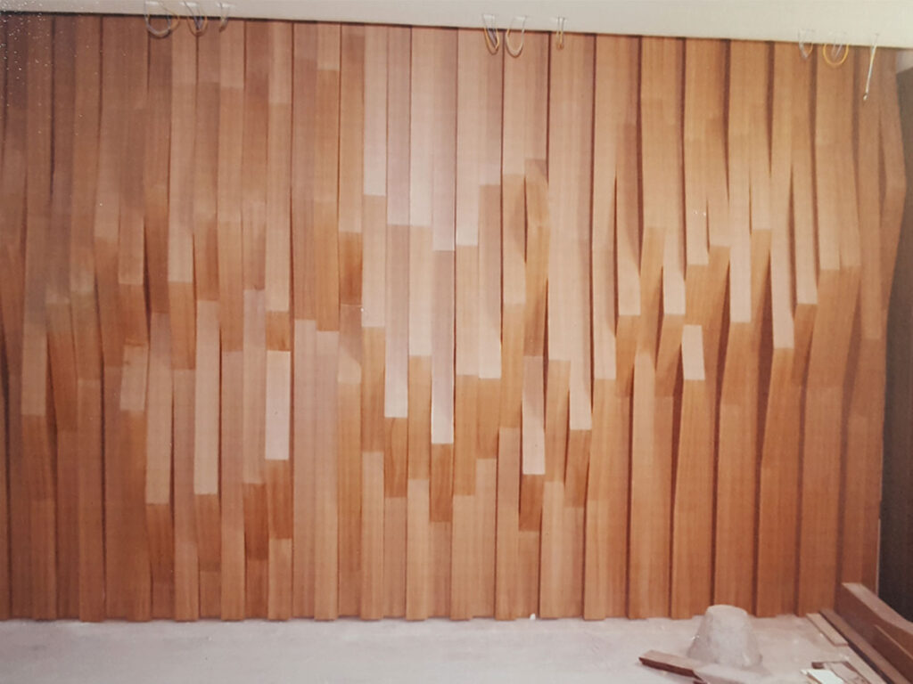 المانهای چوبی که در جداره های داخلی اجرا شده اند برگرفته از سبک دیکانستراکشن می باشد. احساس تعلیق ، ناپایداری و پویایی و استفاده از سطوح و خطوط مورب و کج در جداره ها همچنین همجواری نماد های نامربوط در کنار یکدیگر و تداخل احجام و سطوح معلق در یک ترکیب هنرمندانه از جمله ویژگی هایی است که به بیننده القا می شود