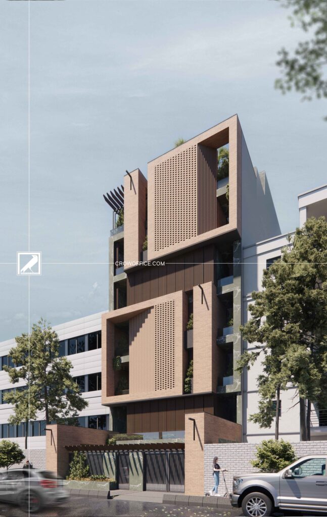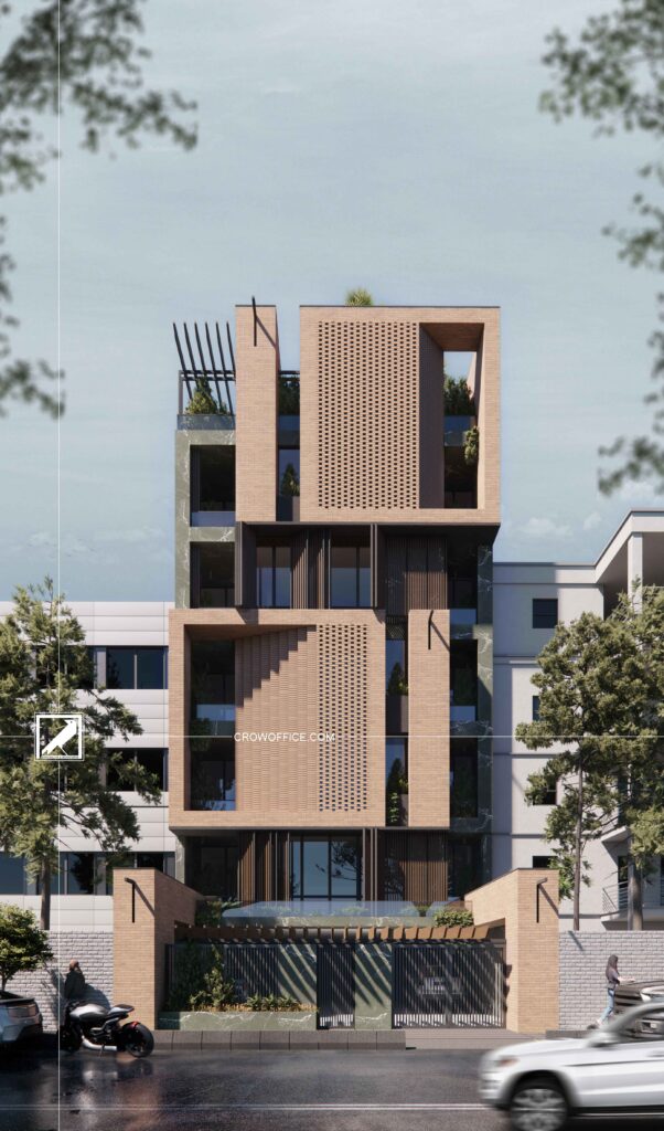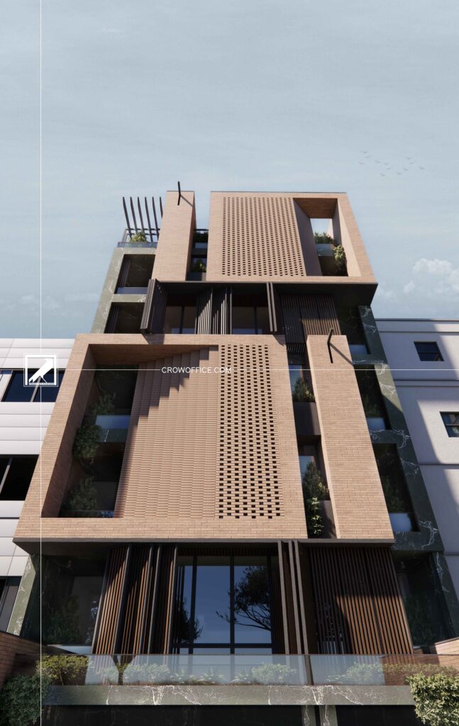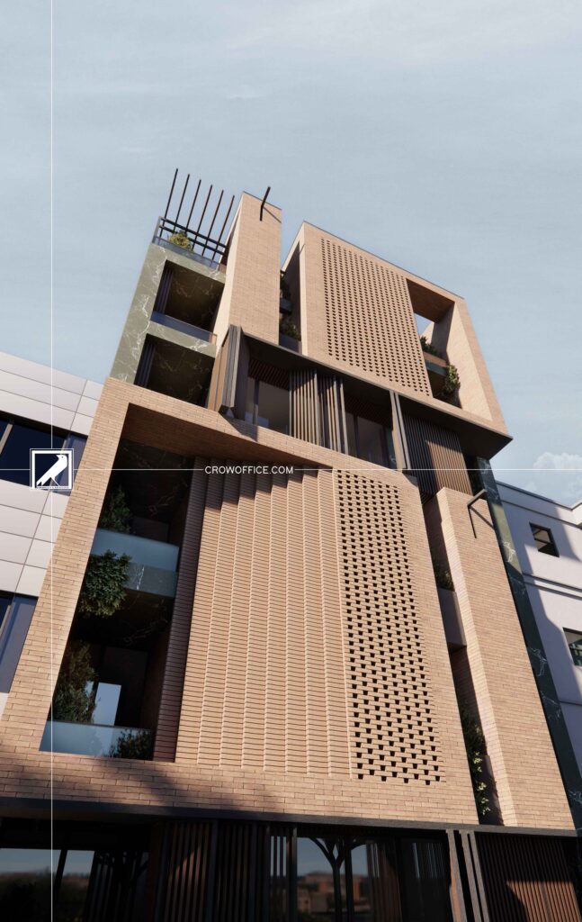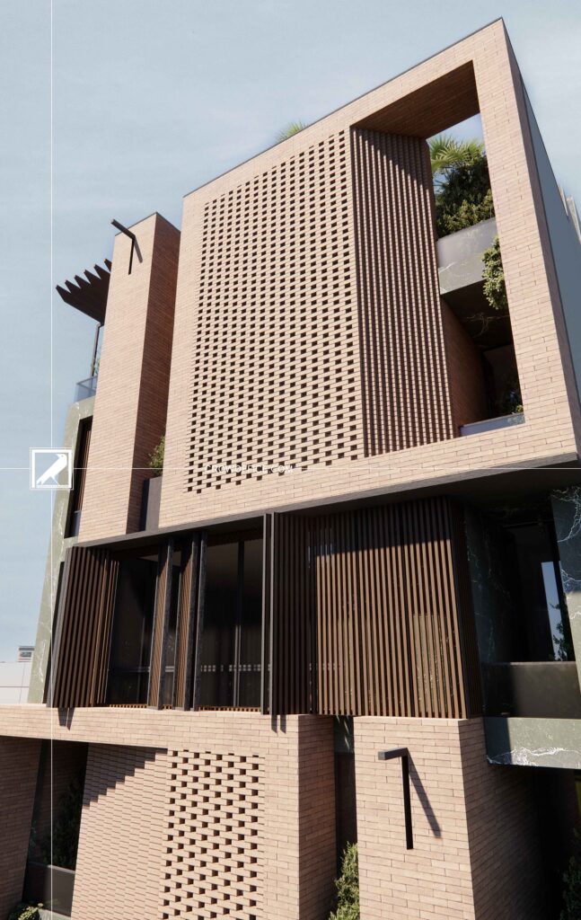 ساختمان شماره ۲۶ که در محلهی باهنر اهواز واقع شده، نمونهای برجسته از زبان معماری معاصر است که در عین سادگی، با مصالح اصیل و حساسیت نسبت به بافت شهری طراحی شده است. این نما بازی هوشمندانهای میان حجمهای صلب و فضاهای خالی دارد؛ جعبههای آجری با قابگیری پنلهای مشبک و فینهای عمودی، عمق و سایهروشن چشمگیری ایجاد کردهاند. دو حجم آجری که به صورت افقی جابهجا شدهاند، حس پویایی و هویت مجسمهوار به بنا میدهند و از یکنواختی ارتفاع جلوگیری میکنند. آجر با رنگ گرم خود در تضاد ظریف با مصالح تیره و سطوح شیشهای، تعادلی دلنشین بین صمیمت و ظرافت ایجاد کرده است.