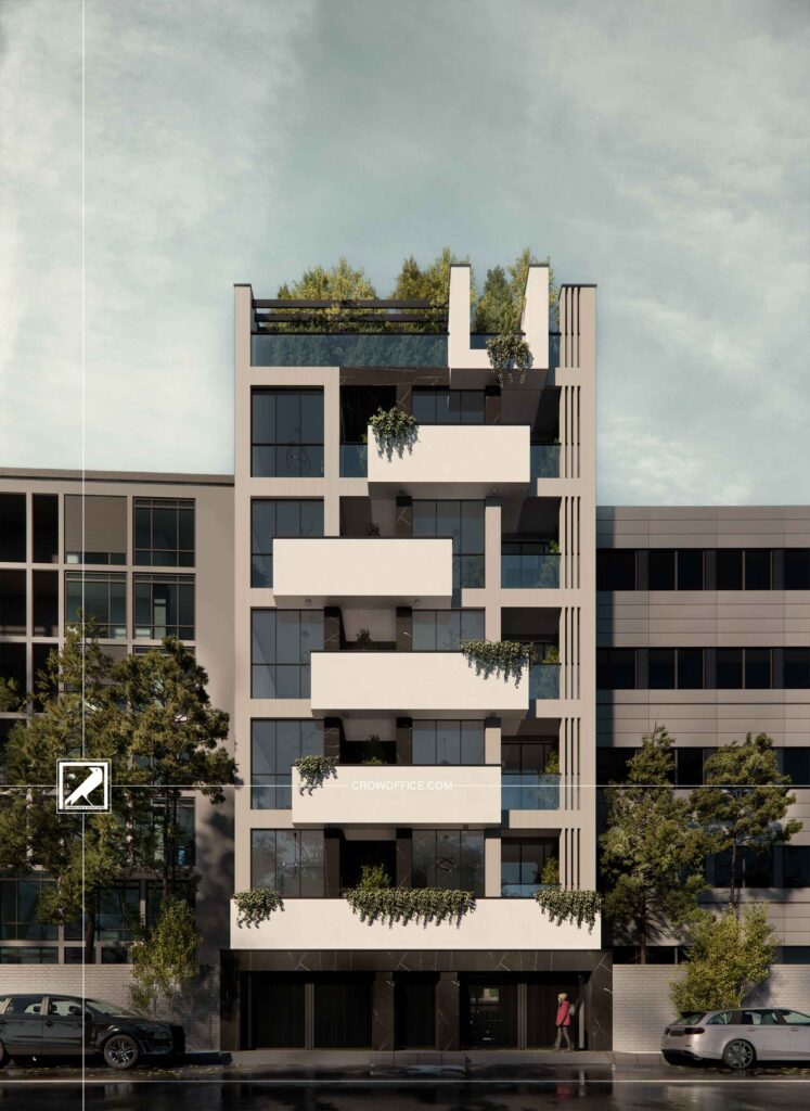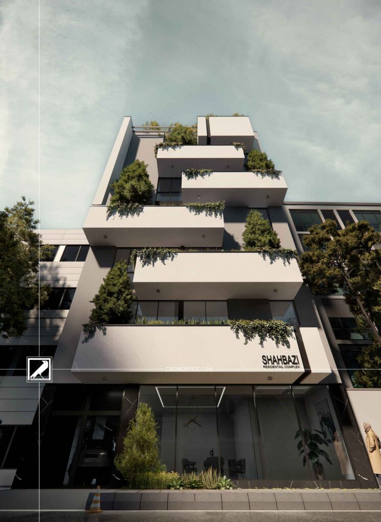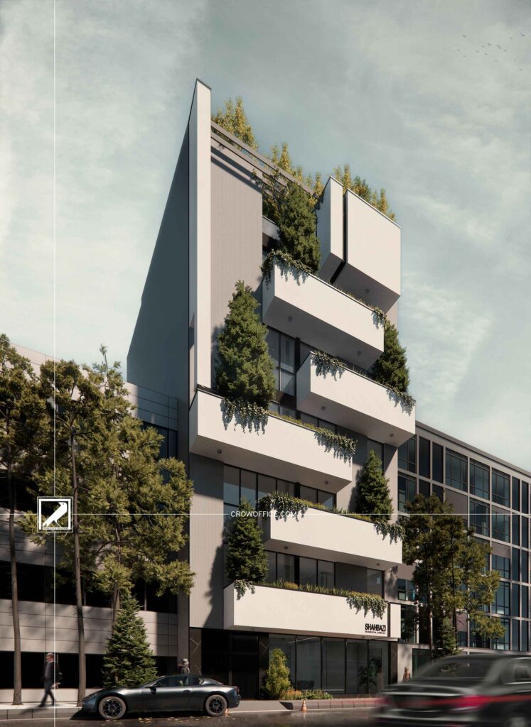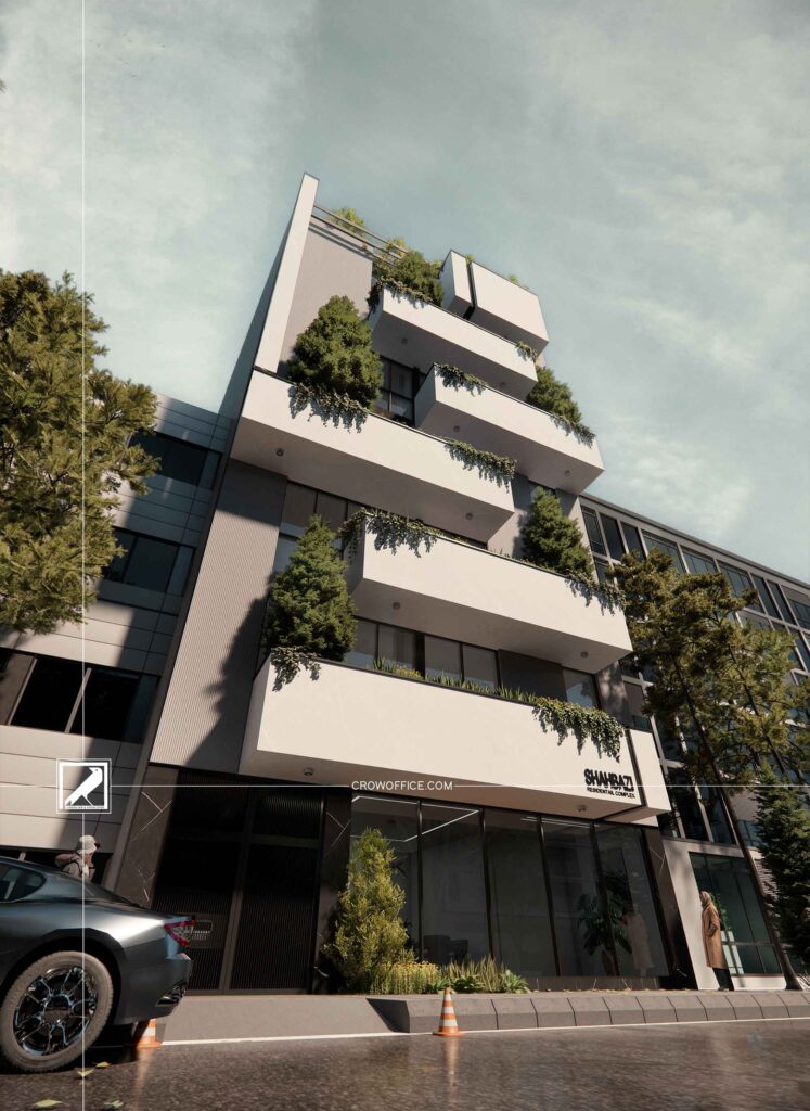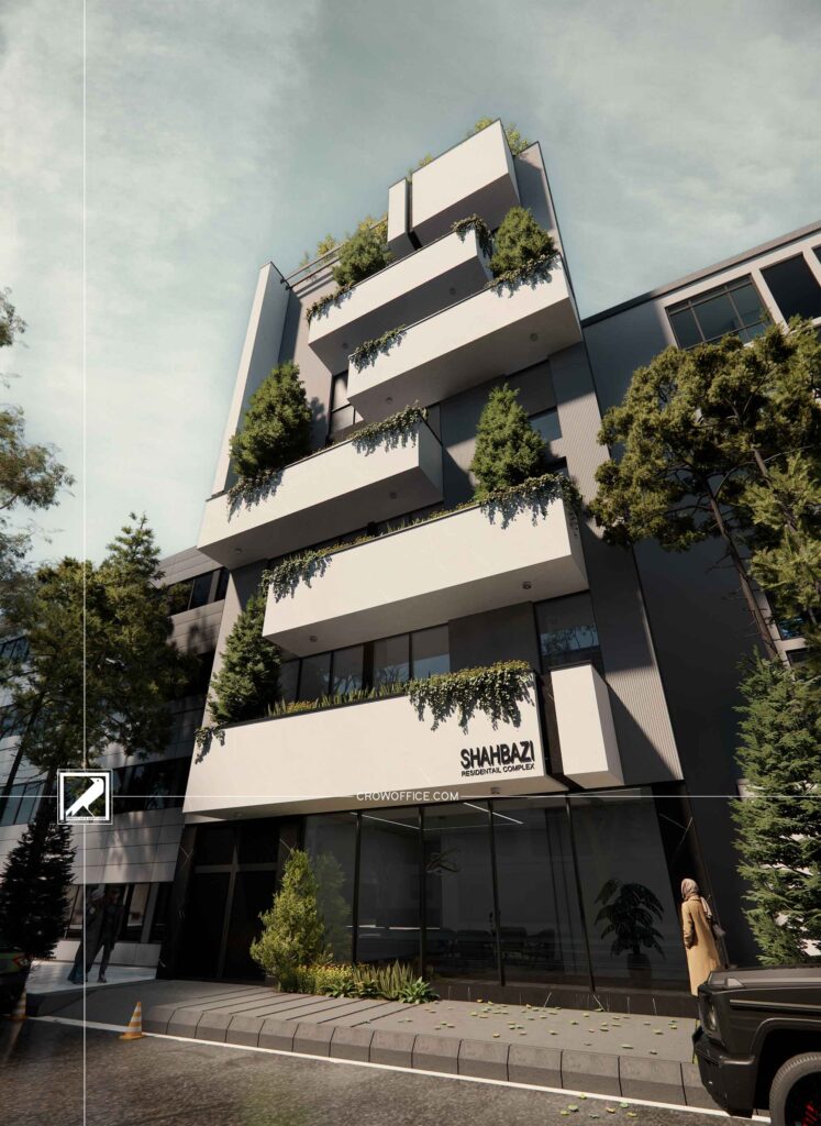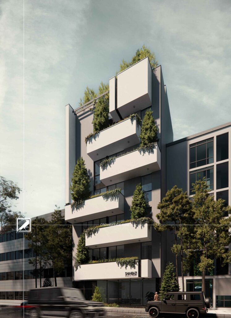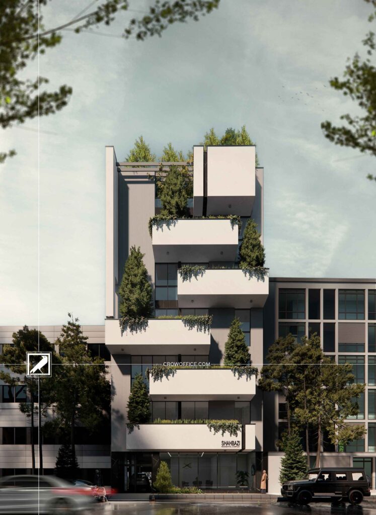ساختمان شماره ۲۹ شهبازی چهارمین همکاری ما با گروه ساختمانی شهبازی است که در لاهیجان، استان گیلان واقع شده است. نمای ساختمان دارای طراحی مدرن با حجمهای مکعبی سفید و تمیز است که ظاهری مینیمالیستی و معاصر ایجاد میکند. تراسهای پلکانی با گیاهان سبز و درختان تنومند غنی شدهاند که معماری را با طبیعت ترکیب کرده و حسی پر جنب و جوش و ارگانیک به سازه میبخشد. تعامل خطوط عمودی و افقی به ساختمان هویتی متمایز و پویا میبخشد. استفاده سخاوتمندانه از نور طبیعی، گشودگی و روشنایی فضاهای داخلی را افزایش میدهد
