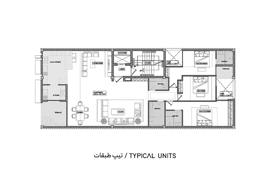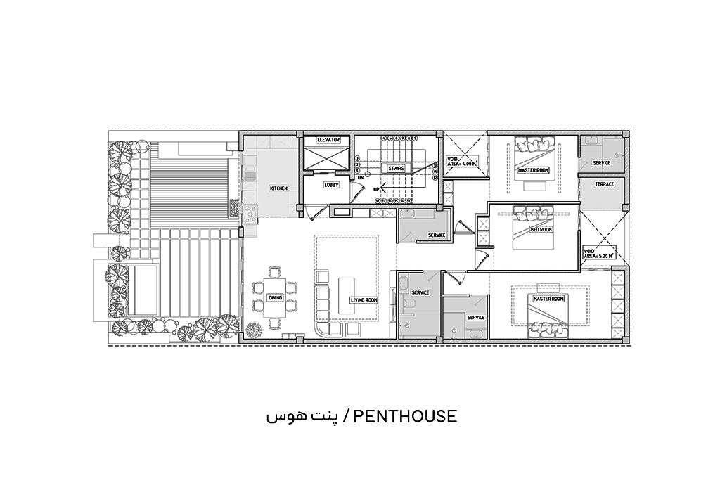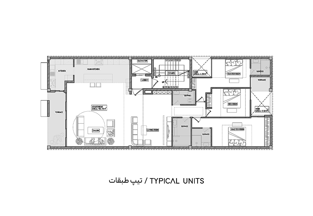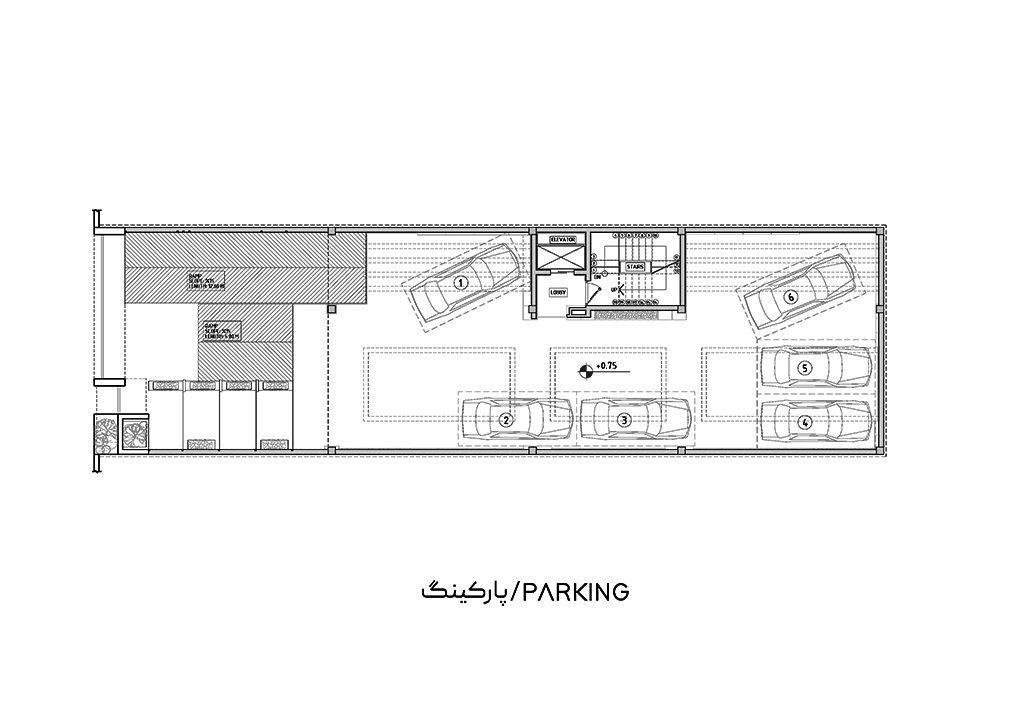 این ساختمان ۷ طبقه دارد. ساختمان دارای ۲ نوع پلان است. طبقات ۱-۲-۴-۶ دارای یک نوع پلان و طبقات ۳-۵ دارای نوع پلان متفاوتی هستند. طبقه آخر پنت هاوس است.