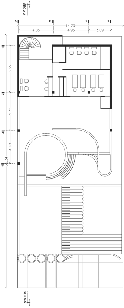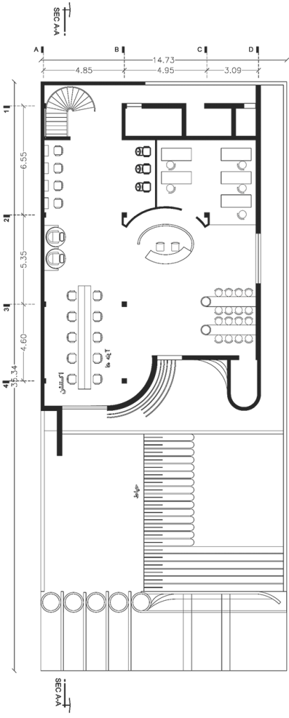 با دقت در فرم پلان و حجم این بنا آنچه به وضوح قابل رویت است استفاده از خطوط نرم در طراحی همه قسمتهای بنا می باشد. خطوط منحنی امروزه در معماری مدرن و روز دنیا امکان ایجاد فضایی با انرژی های مثبت بیشتر و منعطف تر را می نماید
