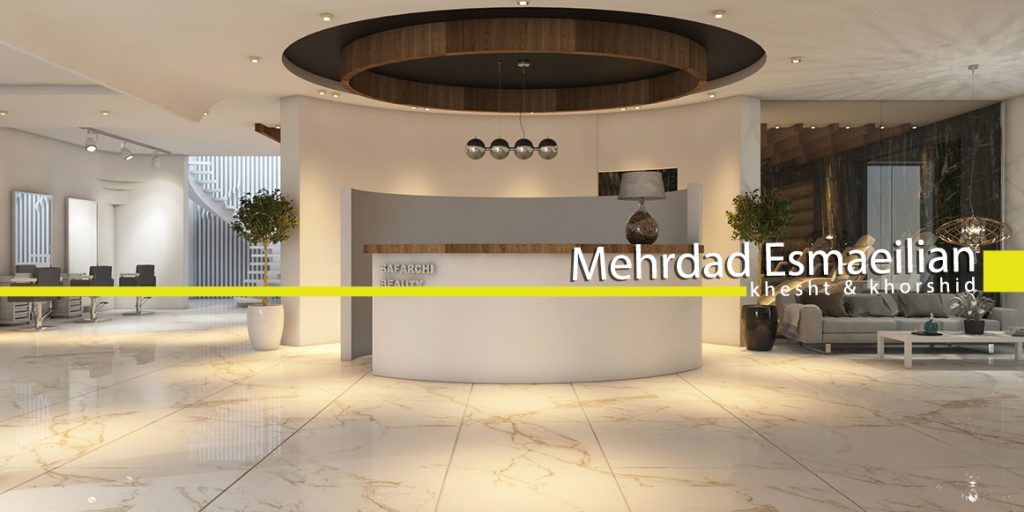 در کنار خطوط نرم پلان اجرای یک قاب و جداره شیشه ایی با سرامیک های خاکستری در پشت کانتر برای لاین مژه و تاتو توازنی با دیوار سبز فضای نشیمن ایجاد کرده که برای بیننده تصویر خوبی را به نمایش می گذارد
