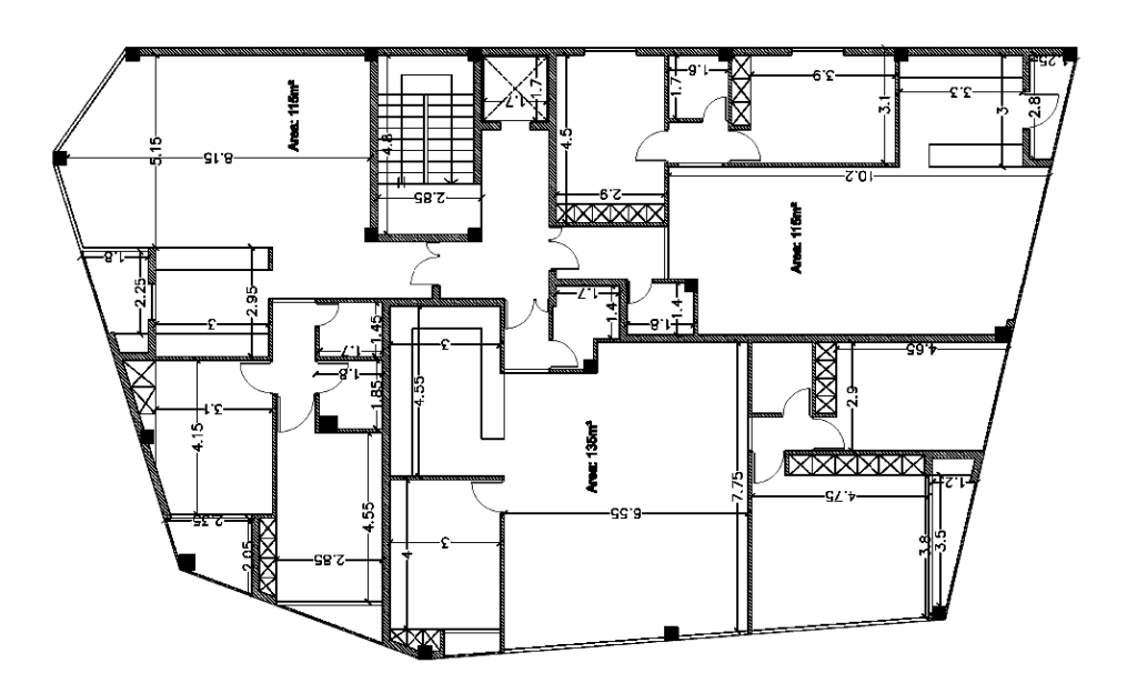 در طراحی نمای این ساختمان اجرای جداره های ایستاده آجری و پروفیل های مشکی در مجاورت جداره ها ، تاکید بر عناصر عمودی در نما را به وضوح به نمایش گذاشته و چون در این طرح تقریبا همه تراس ها حذف می شوند با استفاده از المانهای خطی مشکی ، حرکت و ریتم ایجاد شده در آن برای پوشش دادن کولر ها و آلودگی های تصویری استفاده شده است.