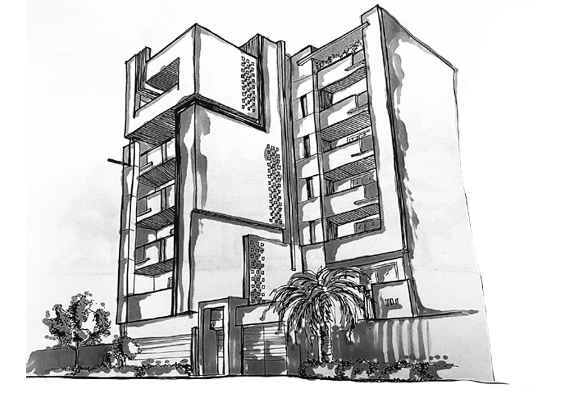 نمای ساختمان از احجام صلبی از جنس سنگ تشکیل شده است که با استفاده از برش سی ان سی و استفاده از پروفیل هایی که روی احجام نما حرکت کرده و جاهایی دچار چرخش شده اند، نمایی مدرن و همسو با طراحی داخلی پلانهای این مجموعه برقرار شده است. در اتصال و رسیدن احجام صلب این بنا از سنگ های مشکی برای نمایش نقطه اتصال استفاده شده است