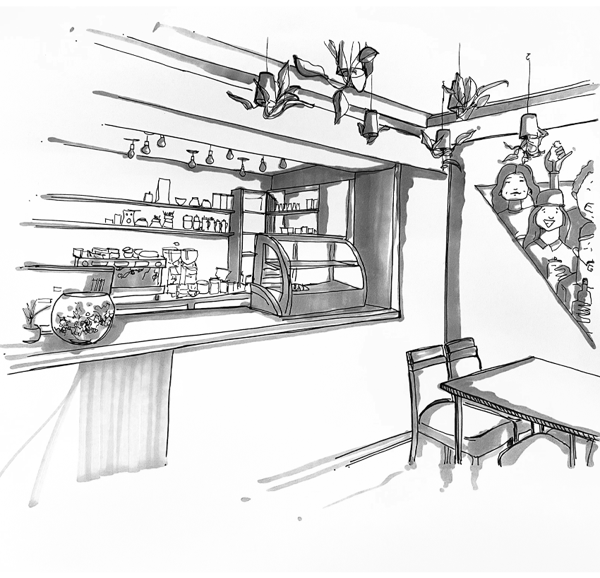 خطوط افقی اجرا شده در جداره ها فضا را پهن تر و سقف را در محل قرارگیری میز ها کوتاه تر میکند که این موضوع فضای کافی شاپ را دنج و صمیمی تر نشان میدهد