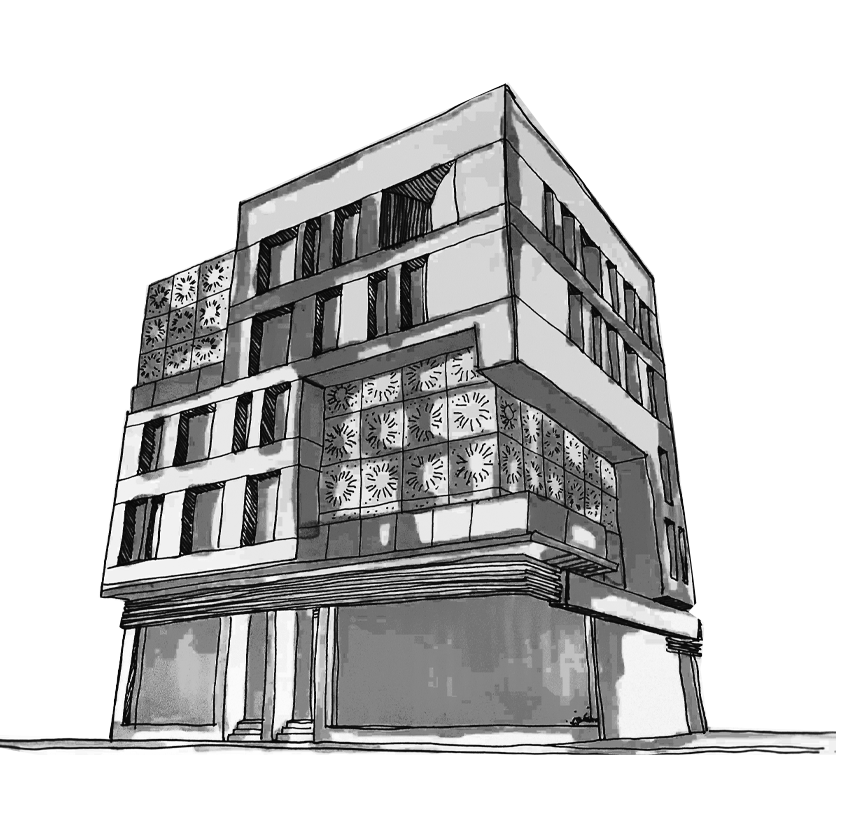 این ساختمان در بندر امام خمینی واقع در جاده اصلی شهر و البته در بخش قدیم واقع شده است. زمین با یک خیابان ۲۴ متری از جلو و دو خیابان ۶ و ۸ متری از طرفین احاطه شده است. با توجه به محل پروژه، با تراکم ۱۰۰ درصد ساخته شده است. ورودی واحدهای پزشکی از خیابان ۸متری است که به لابی اصلی منتهی می شود و بعد از گذراندن امنیت و پذیرش، دسترسی به لابی طبقه را از طریق آسانسور نیز فراهم می کند. در طبقه ی پایین دو واحد تجاری وجود دارد که برای فضاهایی مثل داروخانه و فروش تجهیزات پزشکی استفاده می شود. نما با صفحات بتنی و کامپوزیتی تزئین شده است. بالکن های نامتقارن طراحی هر طبقه را متفاوت می سازد. لابی مستقلی برای کلینیک ها و واحدهای هر طبقه در نظر گرفته شده است. استفاده از شیشههای تمام قد در پشت ورق های کامپوزیتی باعث می شود که قسمت هایی از نما از واحدهای داخلی دیده شود. تلاش شده است که فضای داخلی با استفاده از پنجره ها و نورهای سقفی بزرگتر به نظر برسد. فضای سبز سازگار با محیط زیست نیز پیش بینی شده است