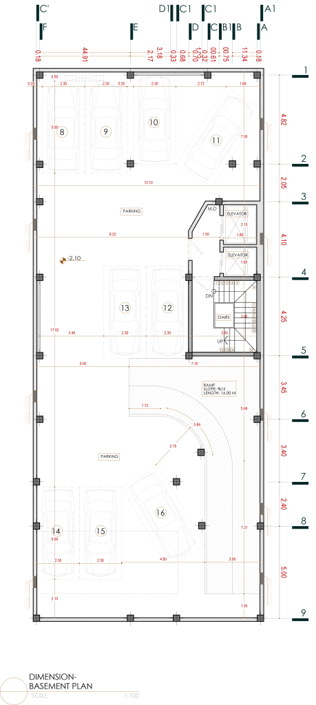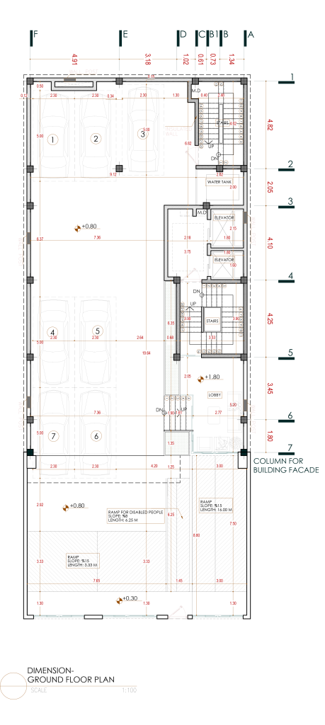 طبقات زیر زمین و همکف برای پارکینگ واحد ها( با احتساب هر واحد ۲ پارکینگ )در نظر گرفته شده است . لابی برج که ورودی آن به صورت معلق روی آب قرار دارد نیز در طبقه همکف قرار دارد .دسترسی به آسانسورها که دارای لابی های مجزا هستند در تمامی طبقات امکان پذیر است .