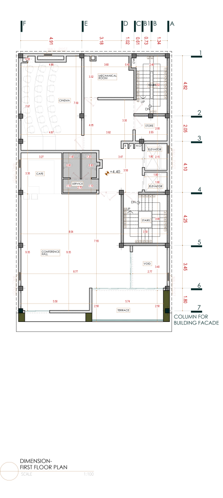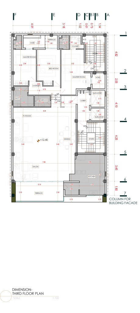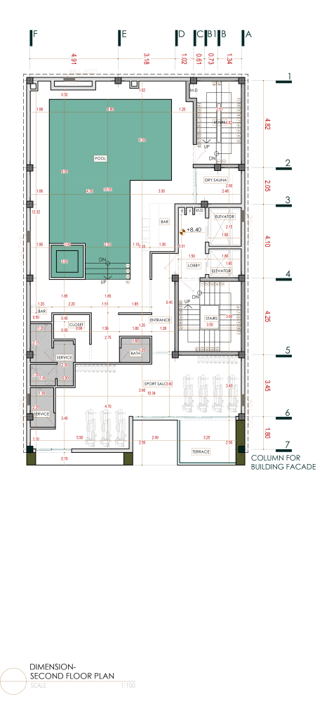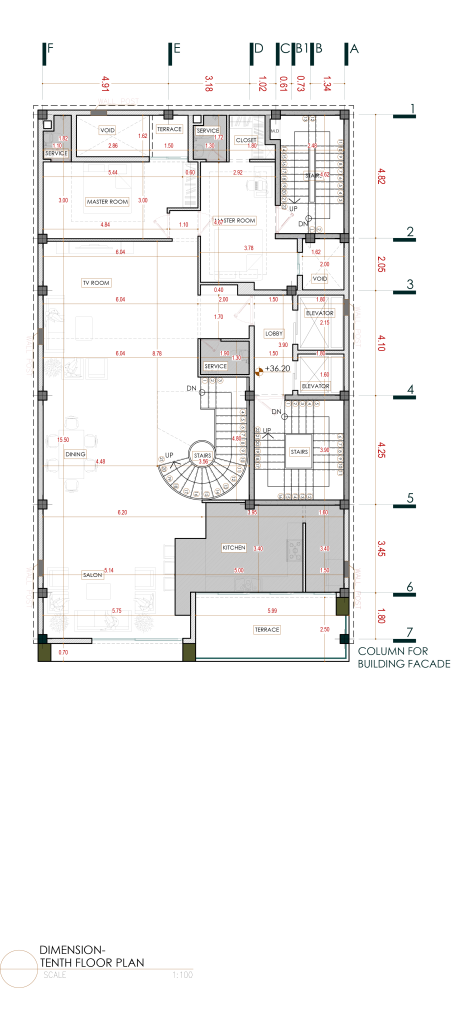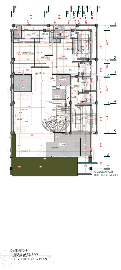 همچنین تلاش شده بااستفاده از سنگ های اسلب در ساختمان به عنوان المانهای عمودی حرکت به سمت بالا و پویایی بیشتری به نما تزریق شود . با توجه قرارگیری آشپزخانه سرد و گرم در جلوی ساختمان امکان نورگیری برای هر دو فراهم شده است .ارتفاع تمام شده این برج ۴۵ متر پیش بینی شده است .