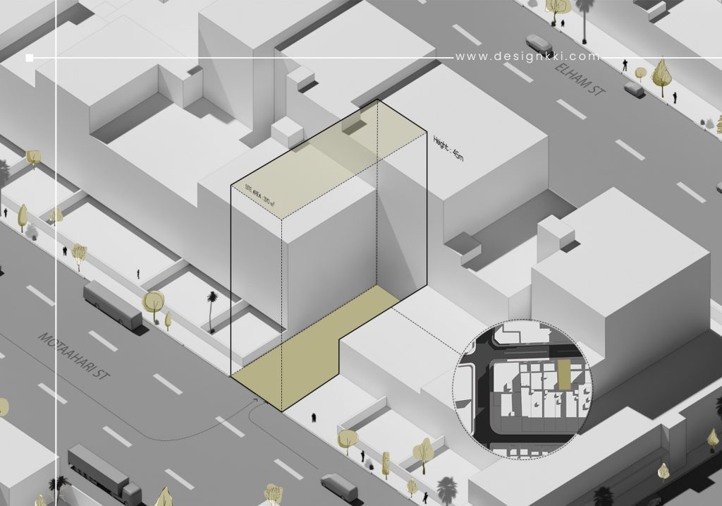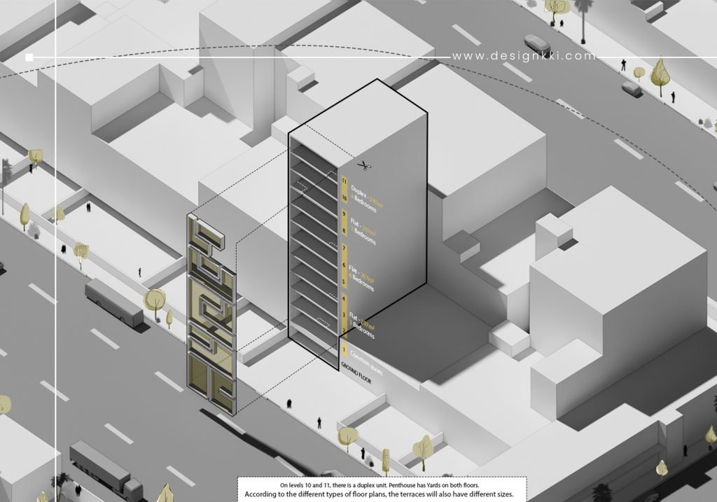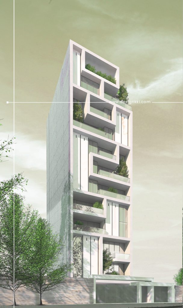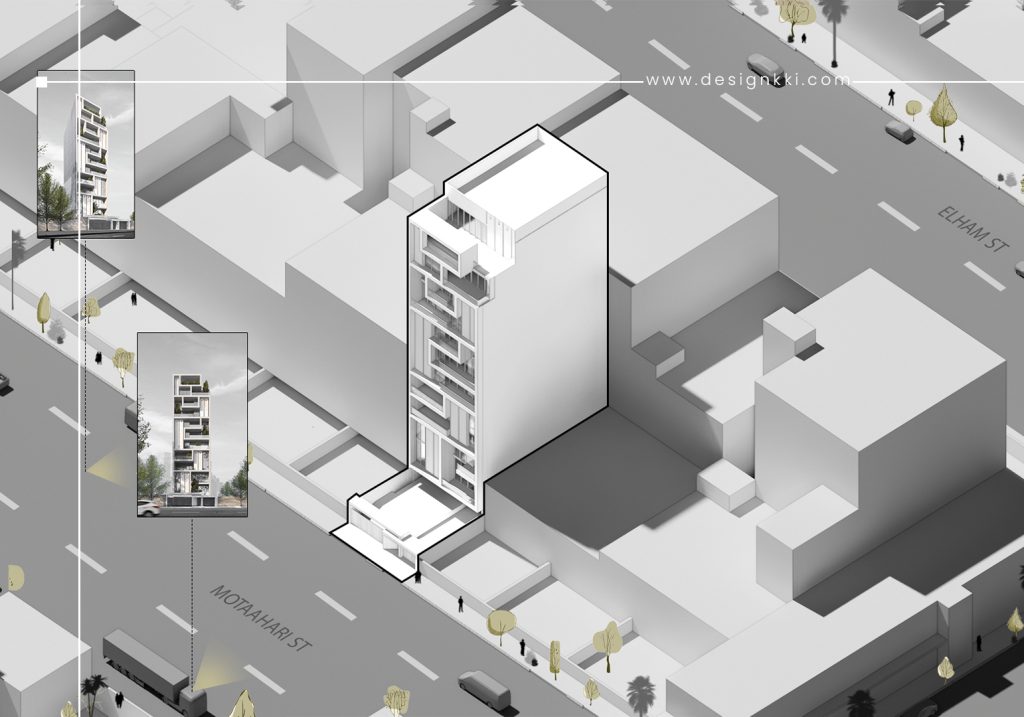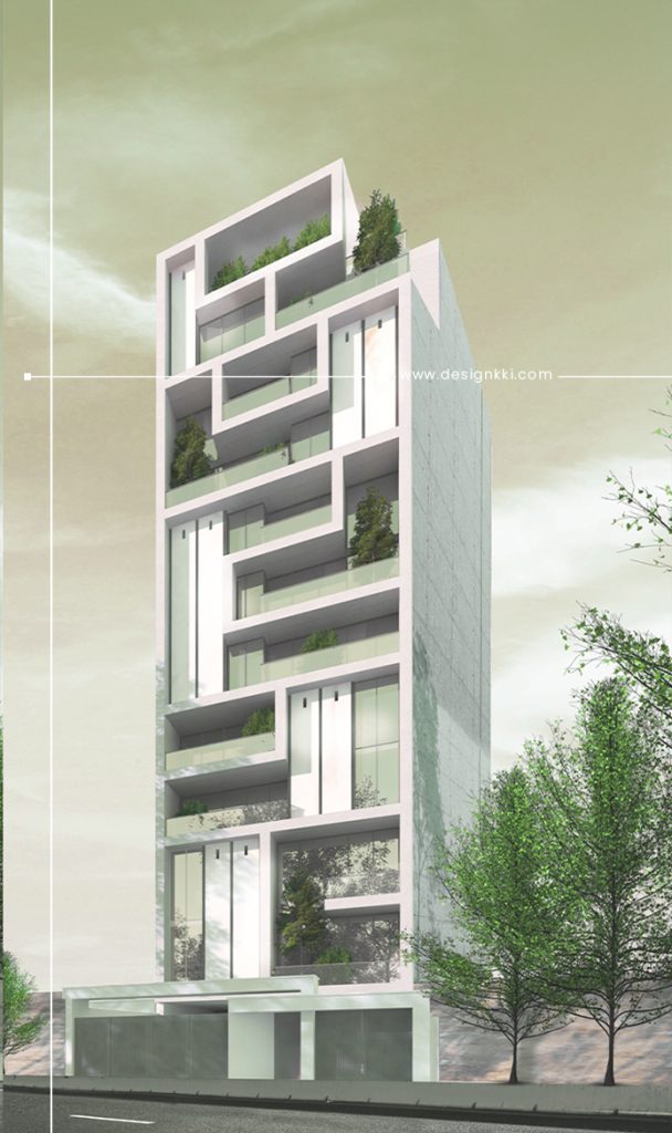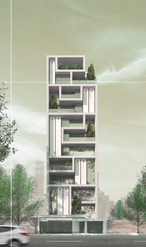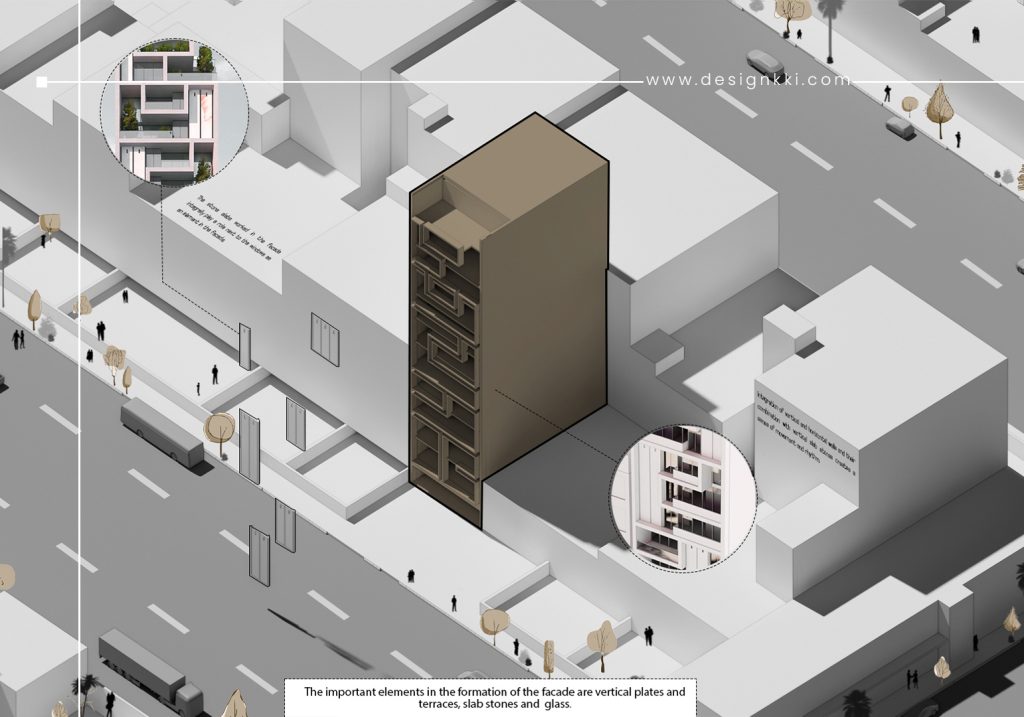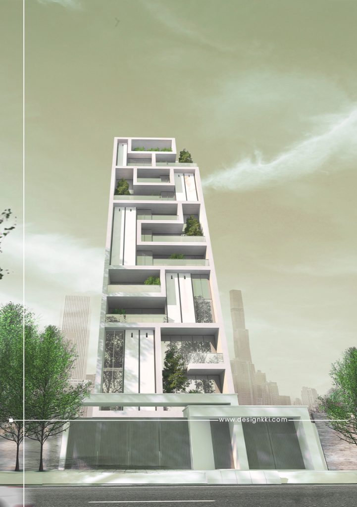 همچنین تلاش شده بااستفاده از سنگ های اسلب در ساختمان به عنوان المانهای عمودی حرکت به سمت بالا و پویایی بیشتری به نما تزریق شود . با توجه قرارگیری آشپزخانه سرد و گرم در جلوی ساختمان امکان نورگیری برای هر دو فراهم شده است .ارتفاع تمام شده این برج ۴۵ متر پیش بینی شده است .