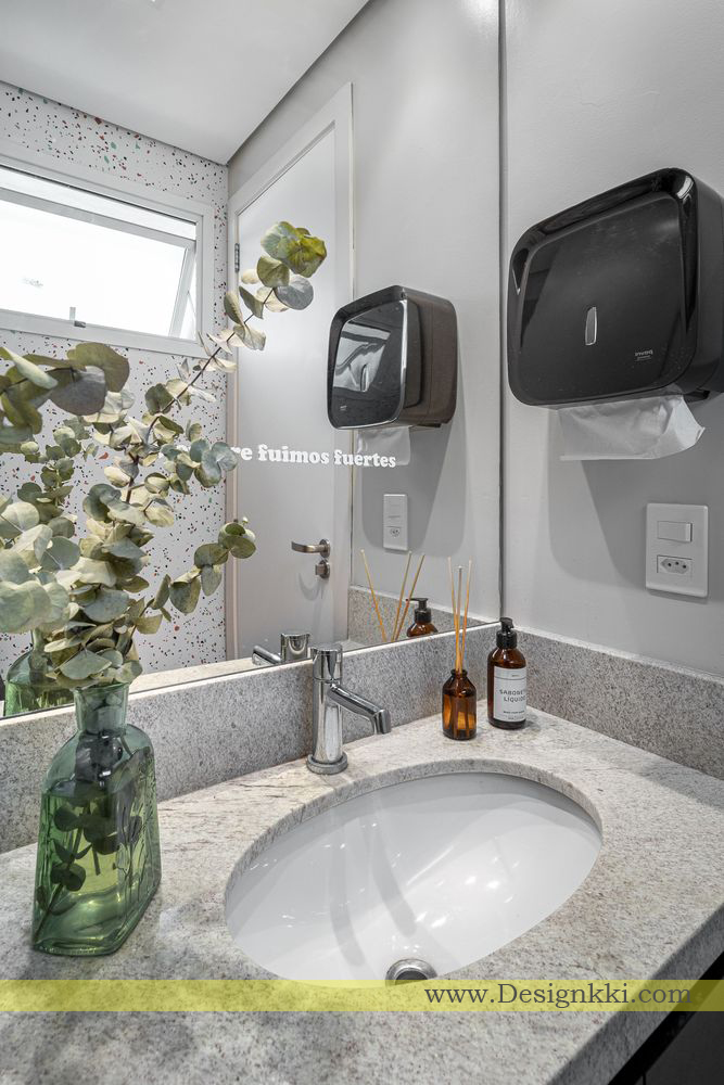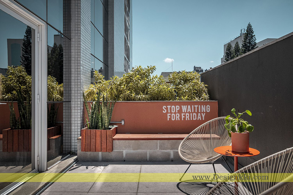 As the main feature of the space, we designed a bookcase in white metalwork, naval plywood and white MDF for the work benches and auxiliary carts for professionals, this materiality is repeated in other furniture in the hall. The laminate floor was replaced by porcelain tiles and there was a need to create a raised platform, covered with the same material, for the passage of the hydraulic piping that feeds the lavatories and the pantry. The toilet was covered with adhesive wallpaper, an alternative to changing the walls coating. The external area was designed as a relaxing space, we designed a bench/chest made with concrete blocks, armchairs, wooden decks and lighting with a string light.