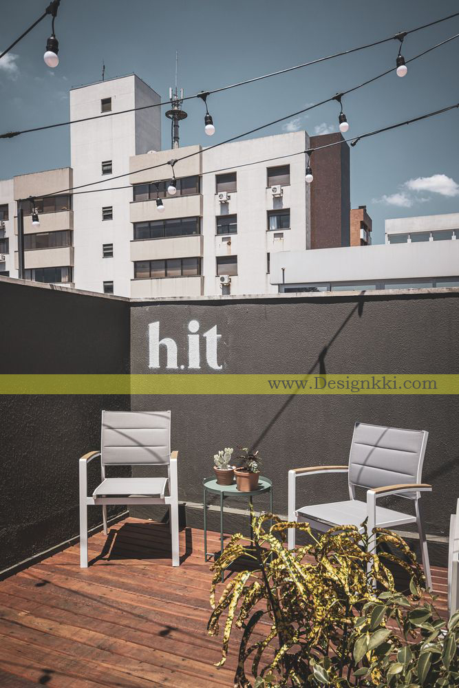 Strengthening the brand identity, a Neon LED sign was used in the main focal point of the room. In the external area, the signaling was done through stencil painting made by the owners themselves, reinforcing the young and urban character of H.it.