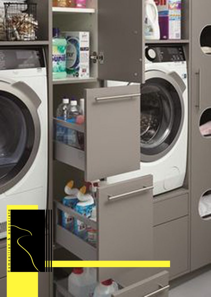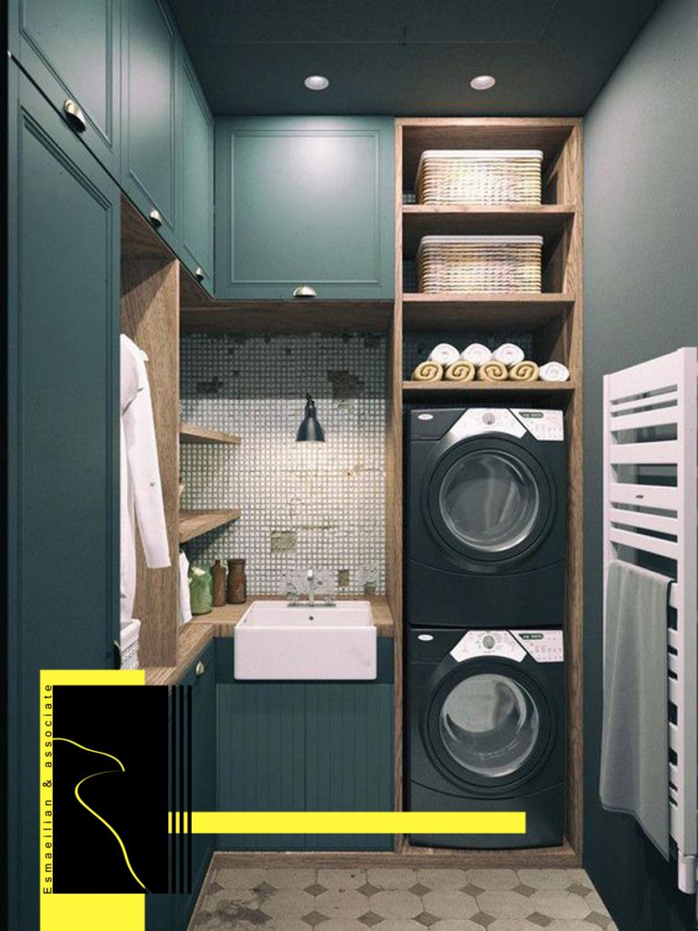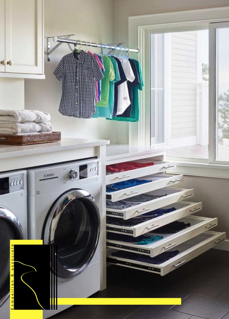Having a place for the items that need to be dried is a big advantage in the laundry (clothes hanger that hangs from the door handles or kitchen cabinets!) Installing a heater directly or even installing a dryer there is a clever design. The space set aside for hanging is also useful for clothes or clothes that have just been ironed.