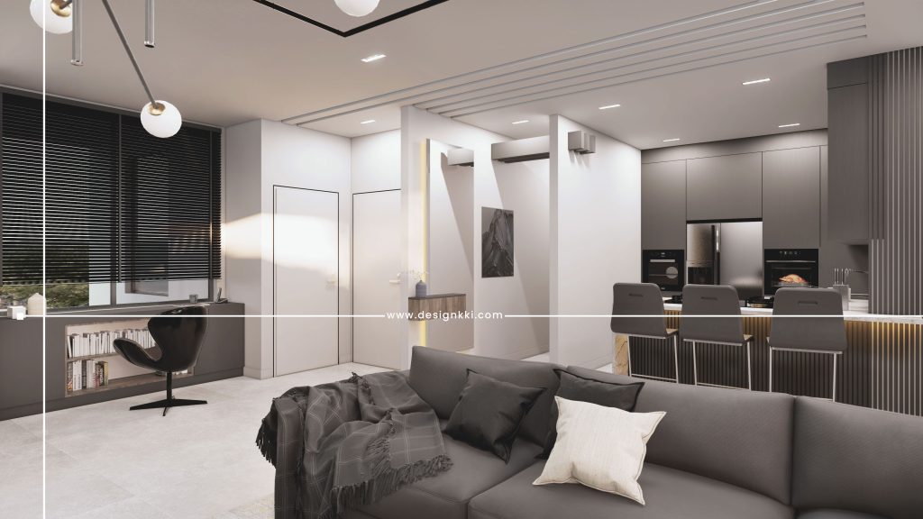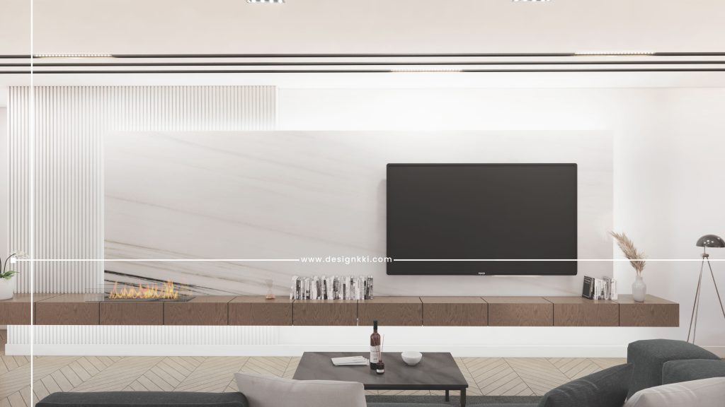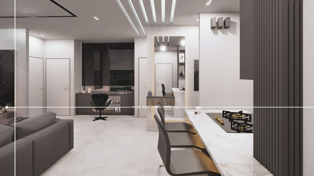 In the design of the private hall and kitchen, non-dense materials with gray color are used and in the TV part, these movements are combined withslab stones and the shelf under the TV.