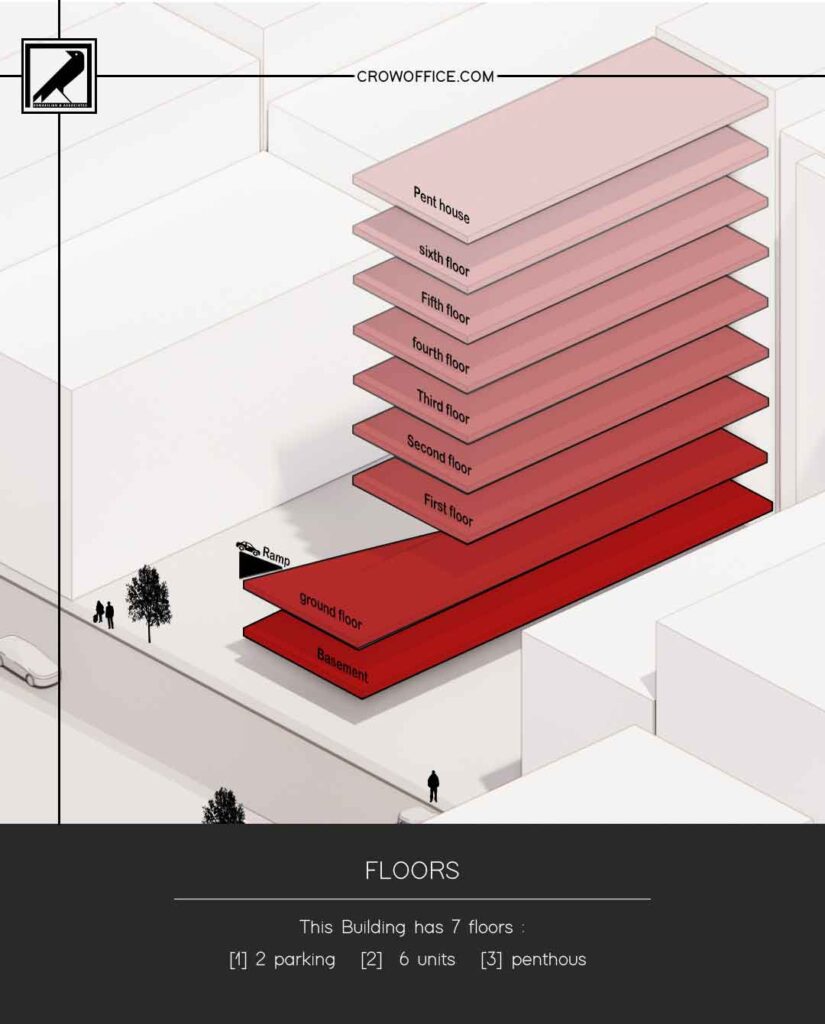 This building has 7 floors . the building has 2 type of plans .floors 1-2-4-6 have one type of plan and floors 3-5 have different type of plan.the last floor is penthouse
