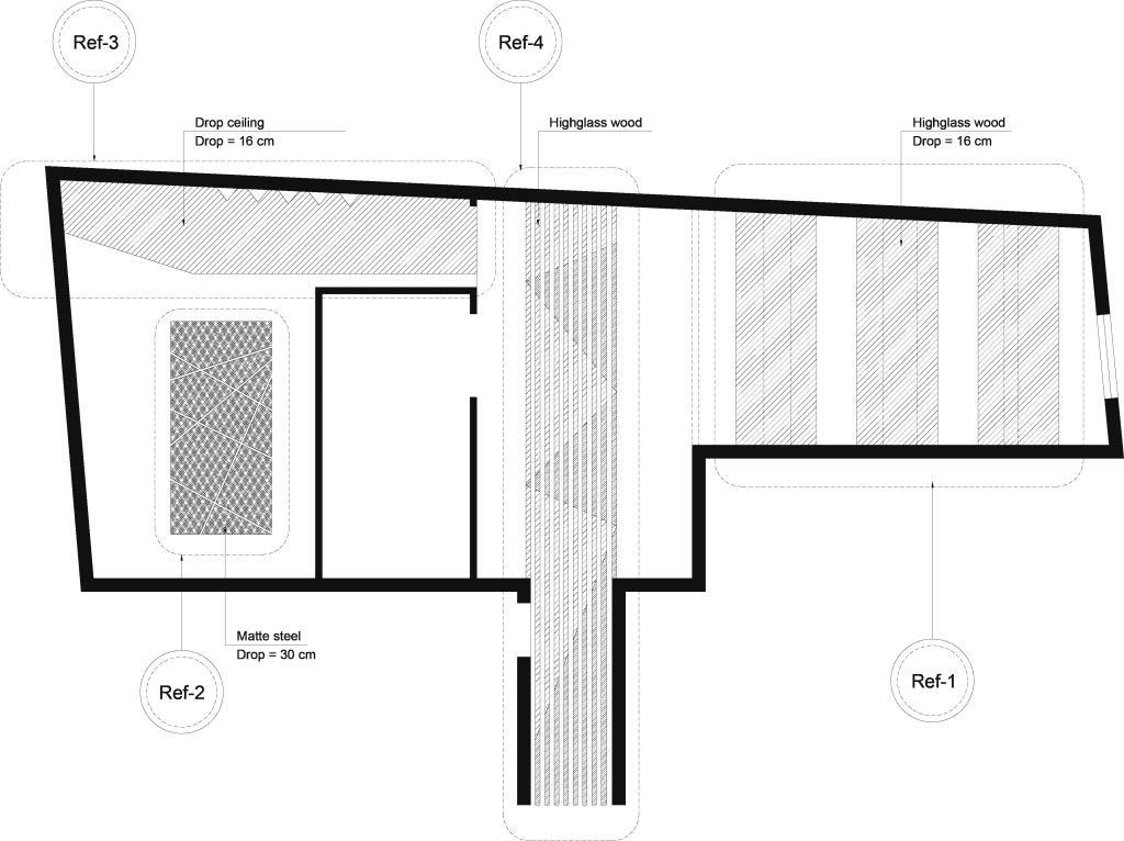 Using wood on the ceiling at the unit entrance and extending it to the back wall of the counter determines the direction of movement and the marking of the counter position.