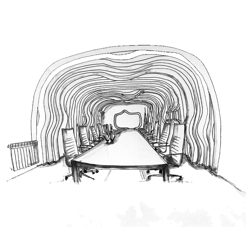 It has been tried to make a difference space in conference room by using a uniform plaster layers on walls and ceilings. Gypsum materials on has used in this room.