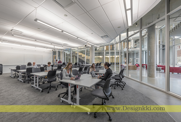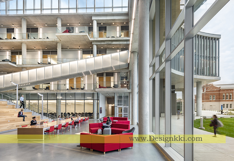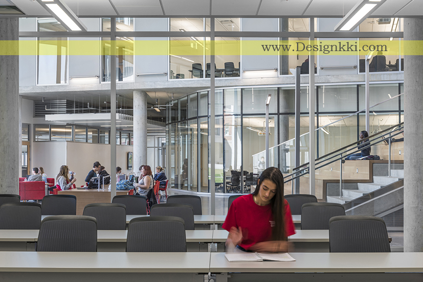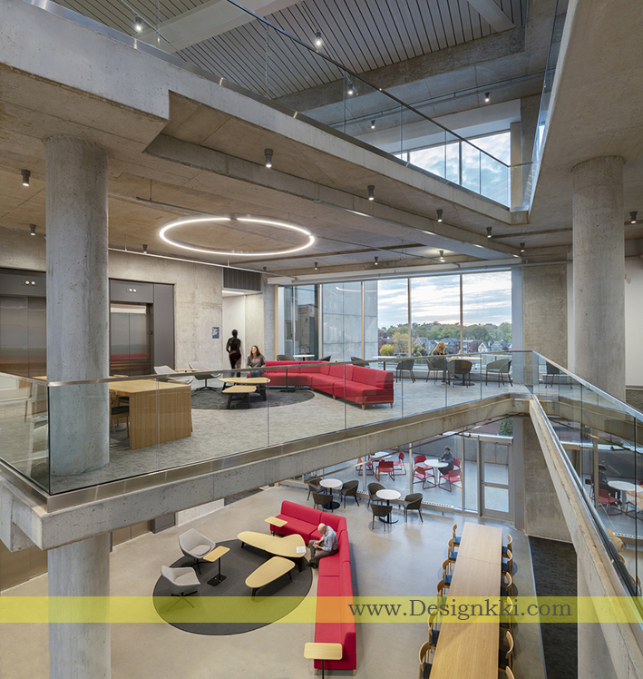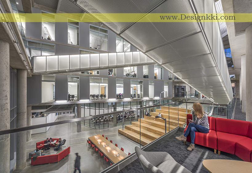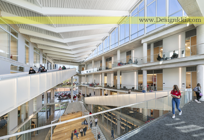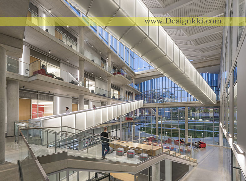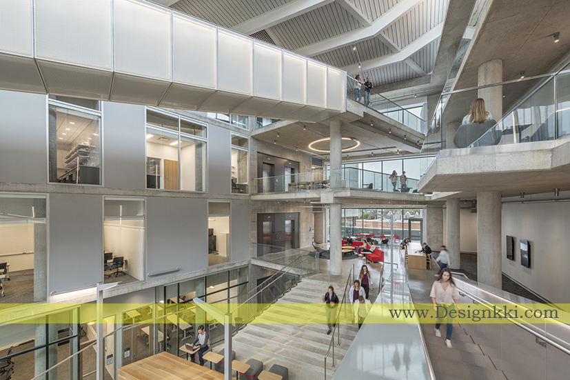 A central atrium hub for collaboration and movement:Bridge-like stepped ramps and monumental stair are distributed in and around the atrium, together with promoting wellness and reinforcing the notion of healthy activity through design. The ramps and stair provide sculptural visual interest and allow views into the classrooms and labs, putting learning on display.