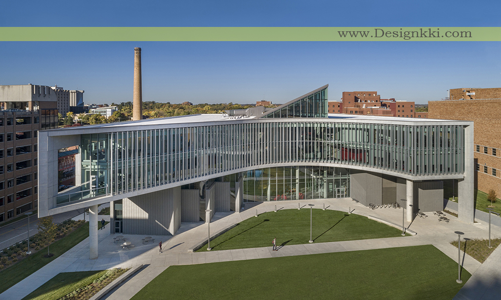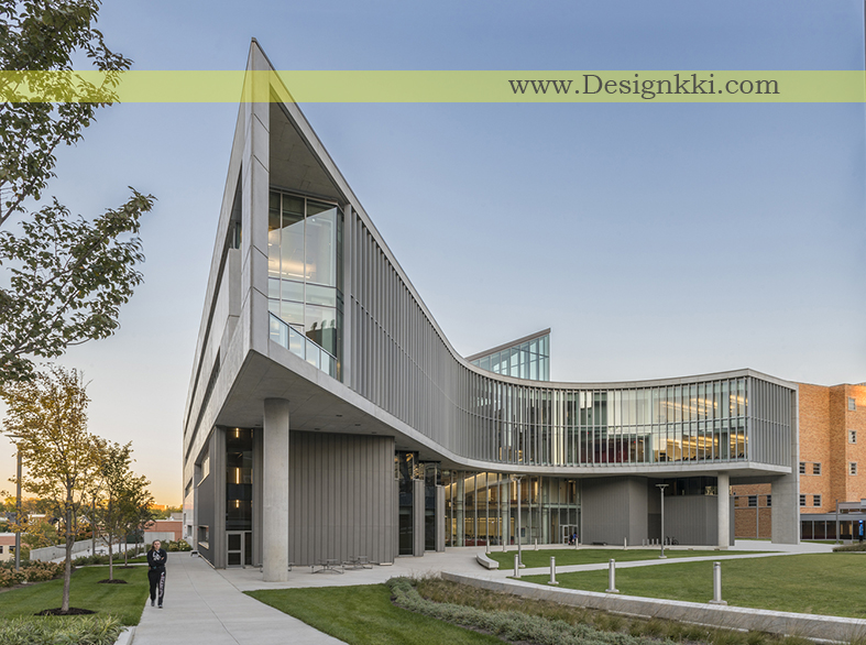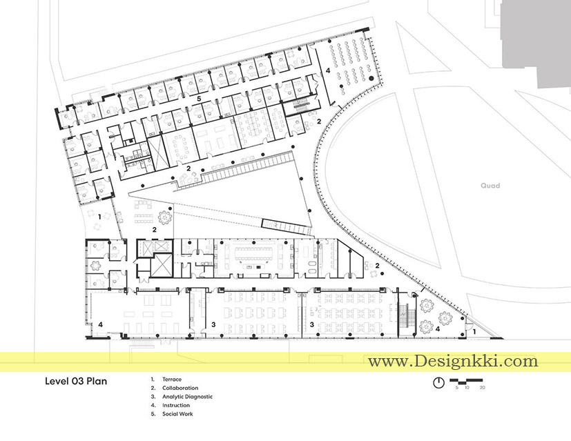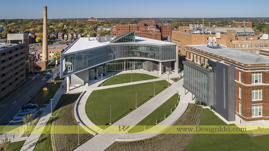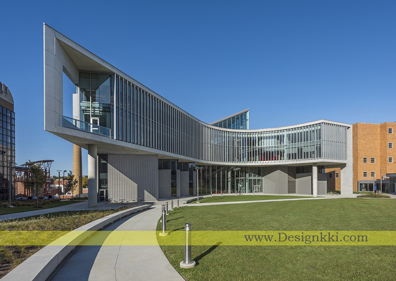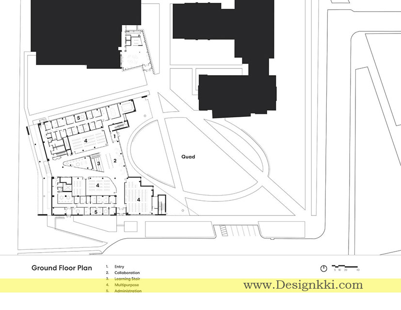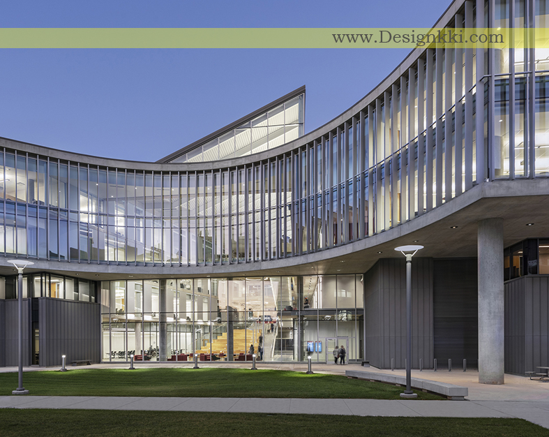 A central atrium hub for collaboration and movement:Bridge-like stepped ramps and monumental stair are distributed in and around the atrium, together with promoting wellness and reinforcing the notion of healthy activity through design. The ramps and stair provide sculptural visual interest and allow views into the classrooms and labs, putting learning on display.