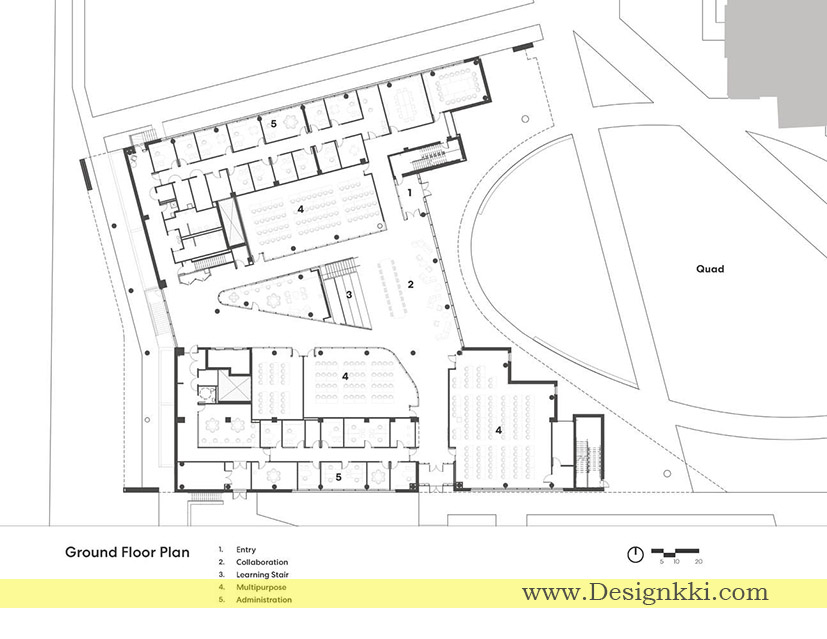 Interdisciplinary collaboration: Glass-walled classrooms and labs feature large, airy breakout areas along with adjacent balconies, providing opportunities for informal discussions and project work.